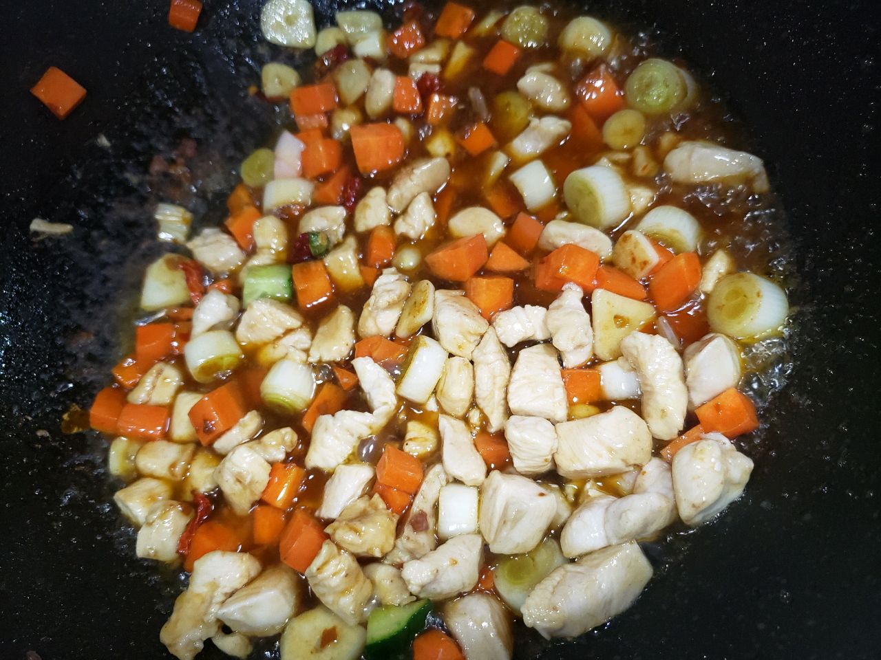 步骤12、炒好的鸡丁入锅,翻炒入味
