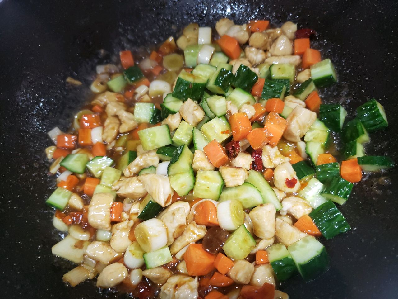 辅料:葱半根、蒜几瓣、胡萝卜1根、黄瓜1根、干辣椒2-3个、郫县豆瓣酱2勺、生抽适量、料酒适量、糖适量、盐适量、醋适量、淀粉适量、花椒(可不放)几粒