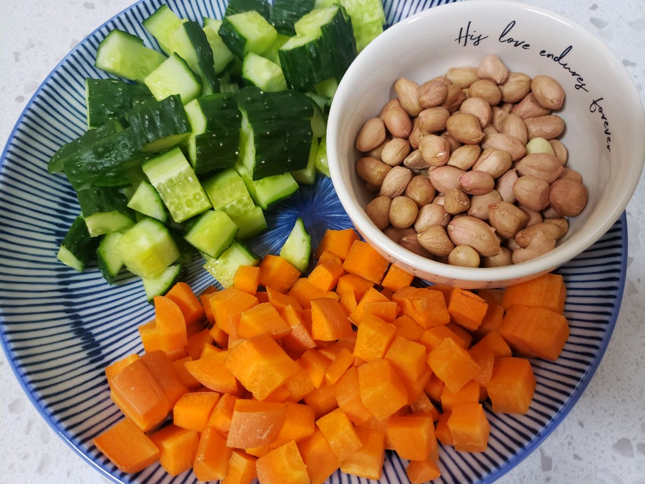 步骤2、胡萝卜,黄瓜,切丁花生一小份准备好