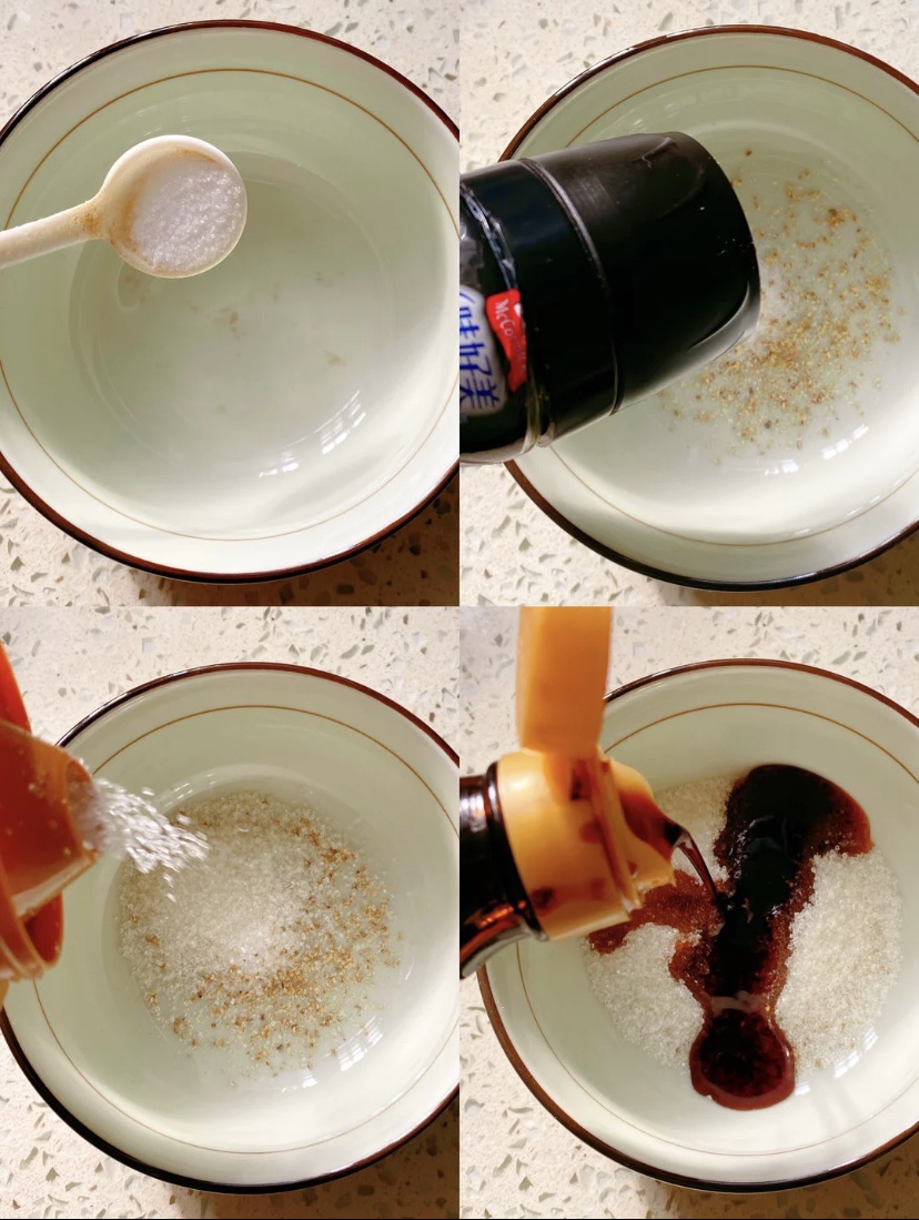 步骤4、灵魂碗汁做法:取一空碗放入盐,胡椒粉,白糖,生抽