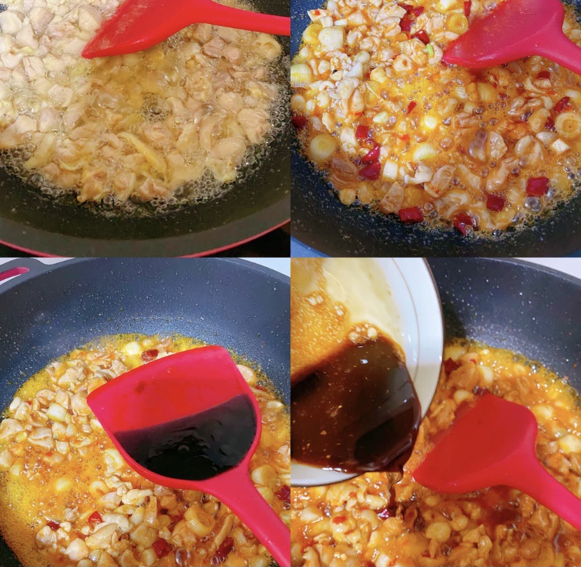 步骤6、起锅烧油烧至六成热,下入腌好的鸡肉块,将鸡肉翻炒至变色,控油捞出。锅中留少许底油,放入豆瓣酱和小料边炒出香味,倒入鸡肉,放入生抽,倒入碗汁和花生米大火爆炒