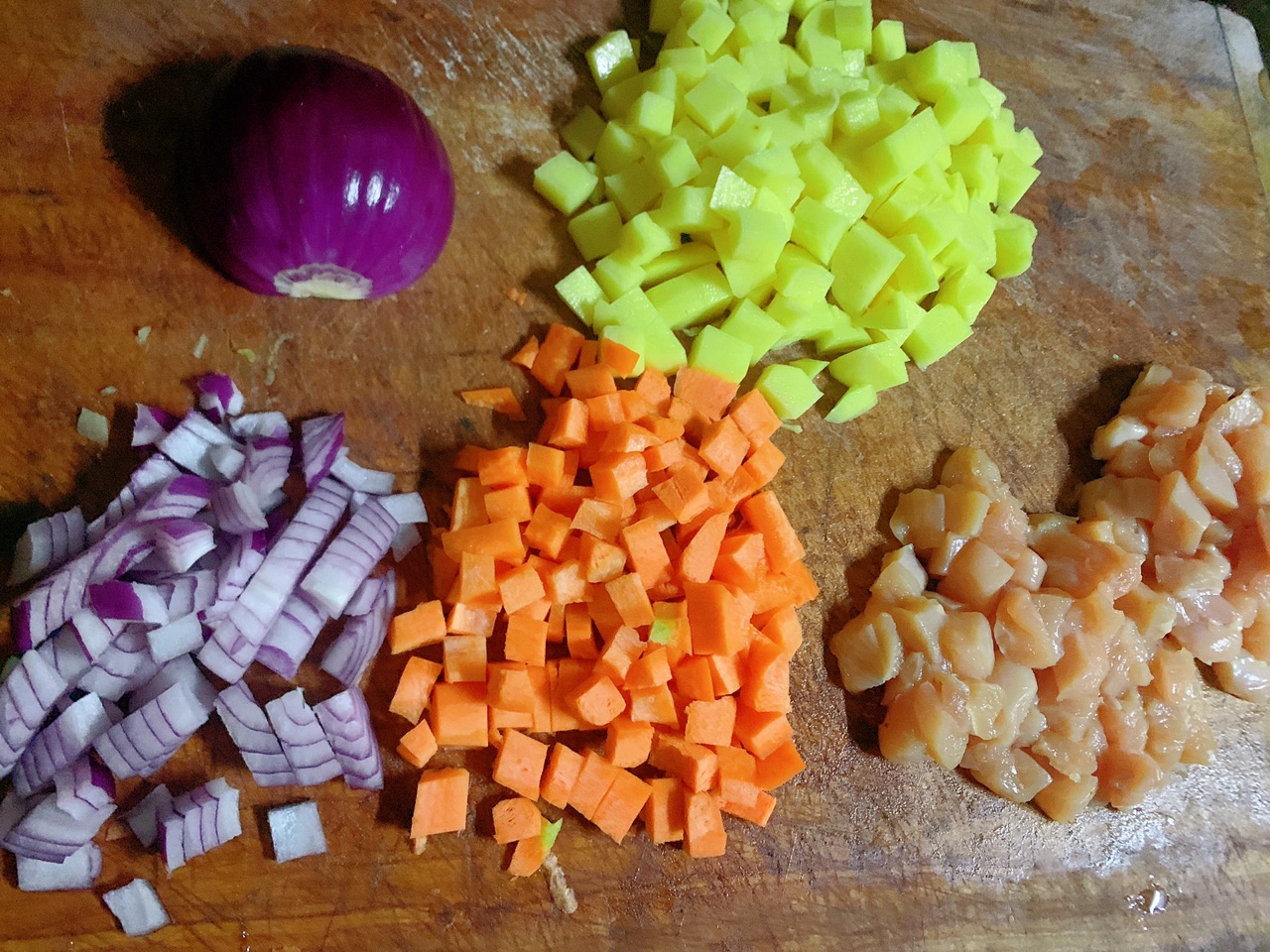 步骤2、把胡萝卜土豆鸡胸肉都切成小丁
