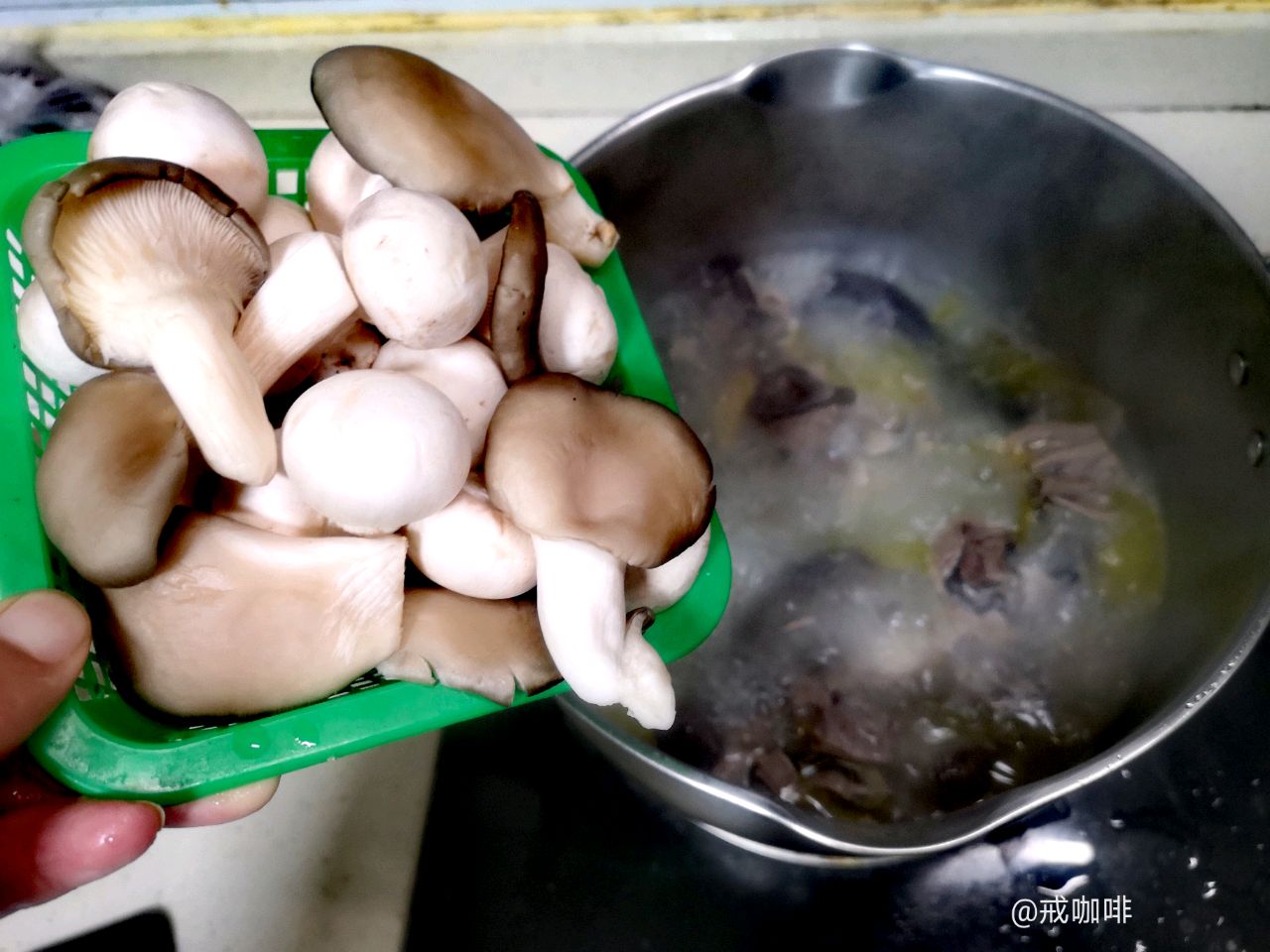步骤5、加入菇菇(白蘑菇,平菇,香菇都是可以的),放适量盐,再炖15分钟。