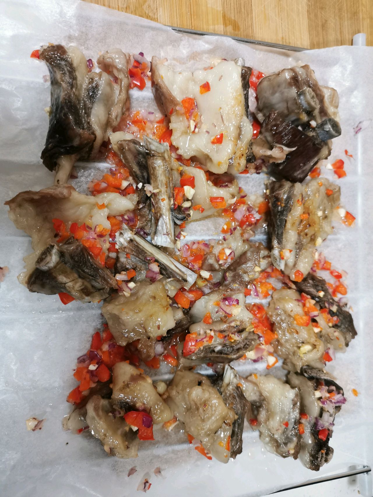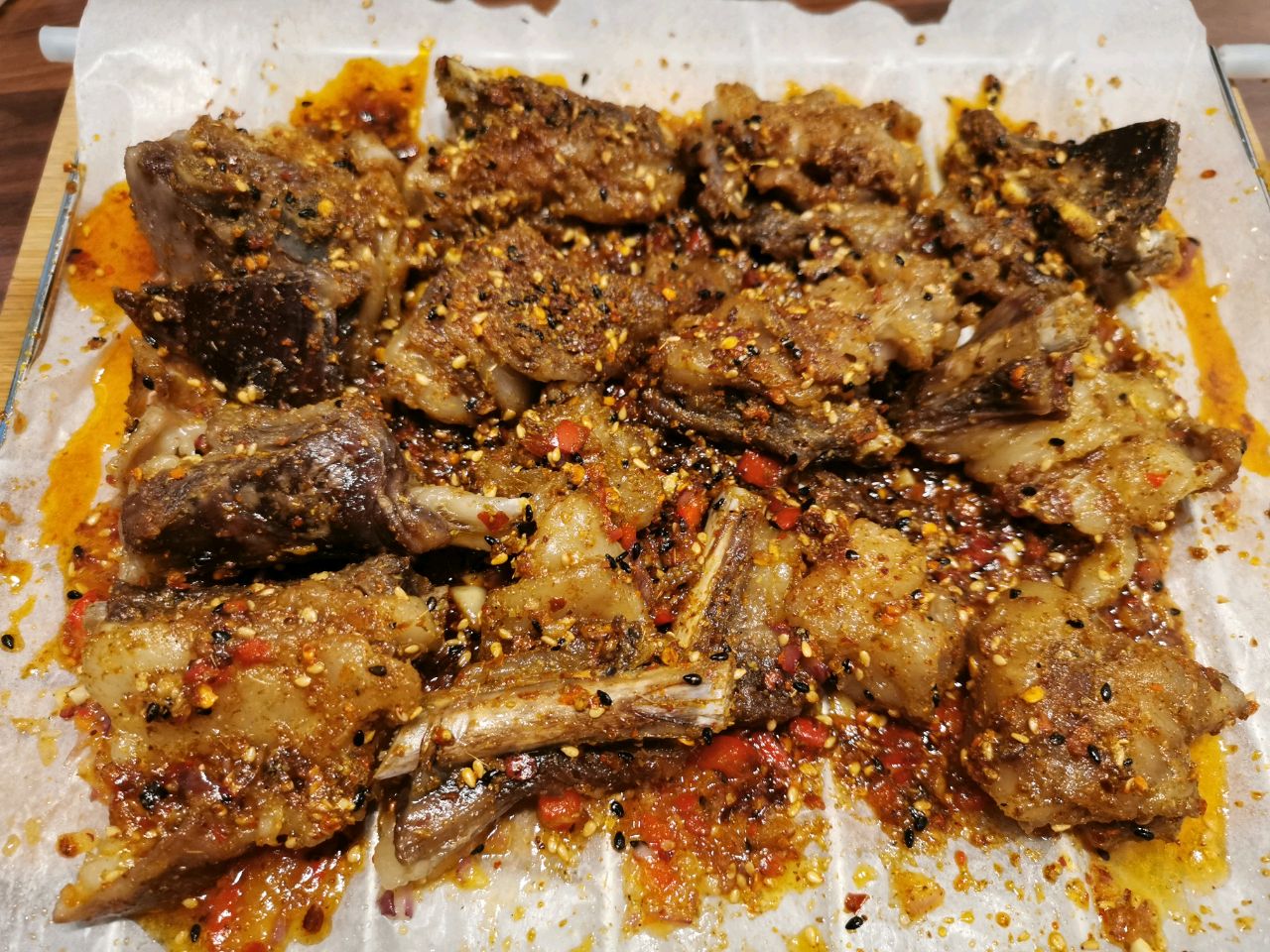辅料:孜然粉3大勺、蜂蜜或白糖2勺或小半勺、黑白芝麻少许、盐一小勺、辣椒粉一大勺、油适量、芝麻油2勺、料酒适量、姜几块、花椒十几粒、蒜6瓣、彩椒小半个、葱2根