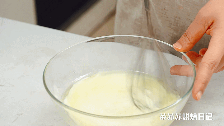 步骤2、碗里倒入牛奶、玉米油、糖,打至乳化状态