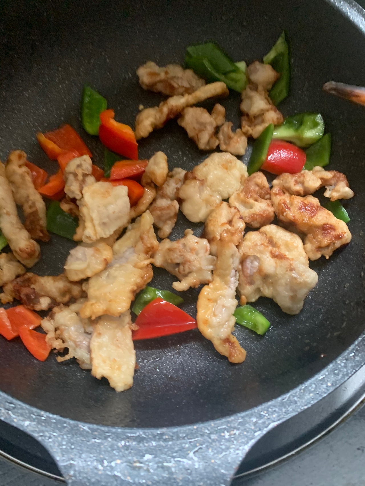 辅料:盐10g、料酒1勺、面粉100g、糖60g、白醋90g、米醋10g、青红灯笼椒适量