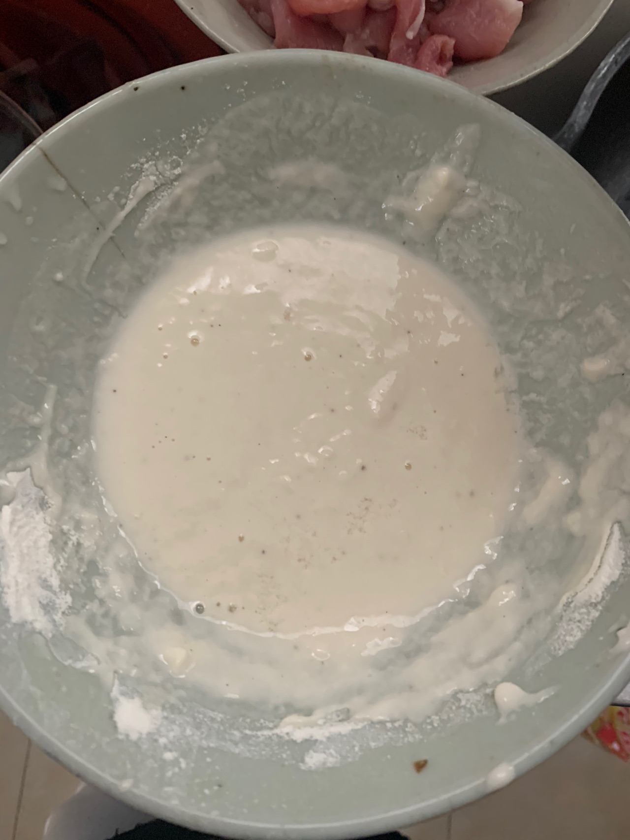 步骤2、面粉与清水的比例是1:1,加少许盐,黑椒粉搅拌均匀。