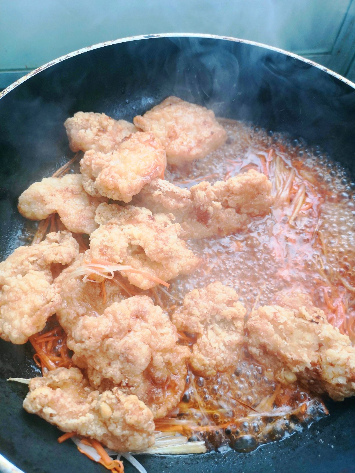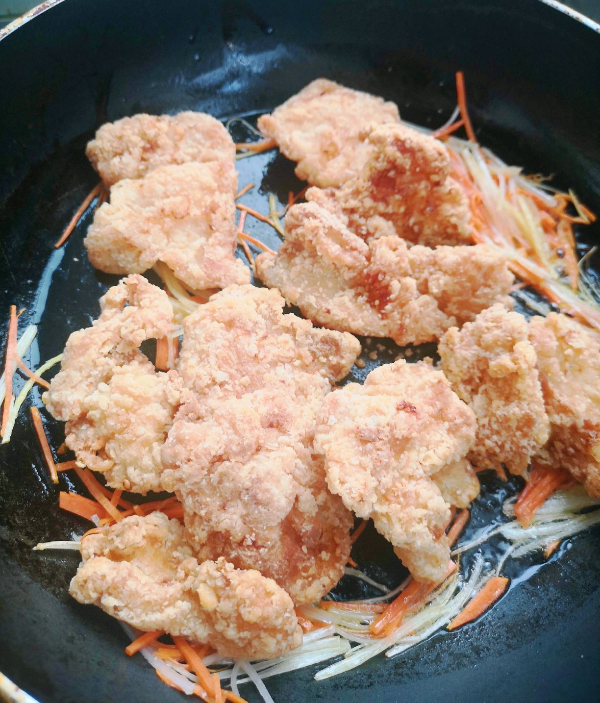 步骤4、倒入炸好的肉片