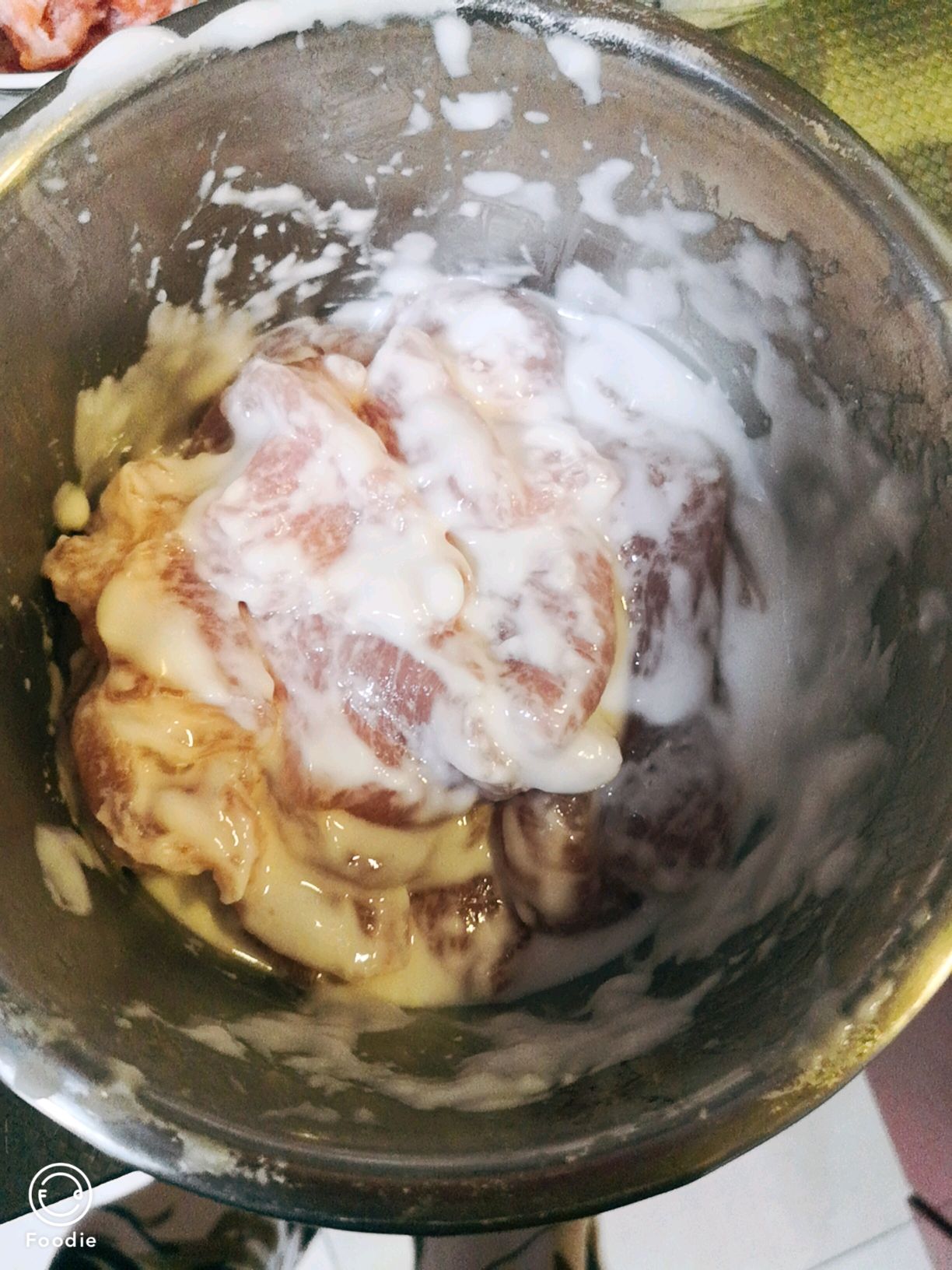 步骤4、用泡好的淀粉抓匀肉,在倒入少许油抓匀