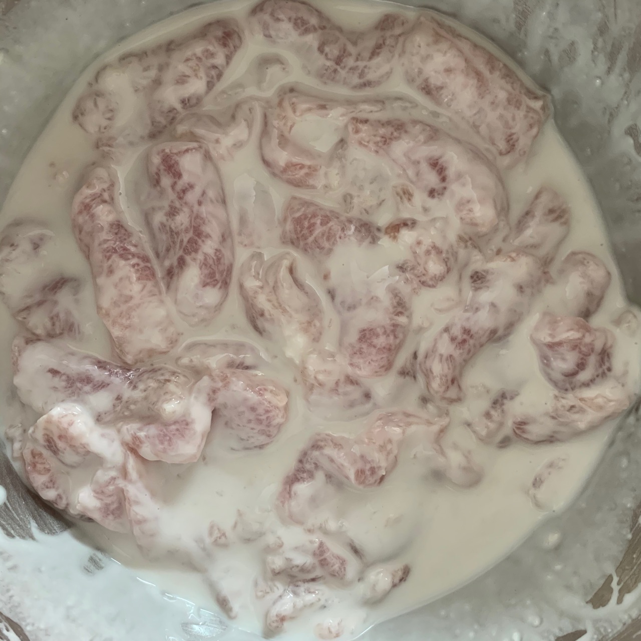 步骤1、先泡淀粉,土豆淀粉加水(根据肉的多少来调整,我一斤肉泡了差不多半斤还剩下点没用完)要多泡一会,把淀粉泡实,到淀粉沉淀下去,上面会有一层水(图中是把上面的清水到掉之后的样子)淀粉要泡好否则炸肉的时候会崩