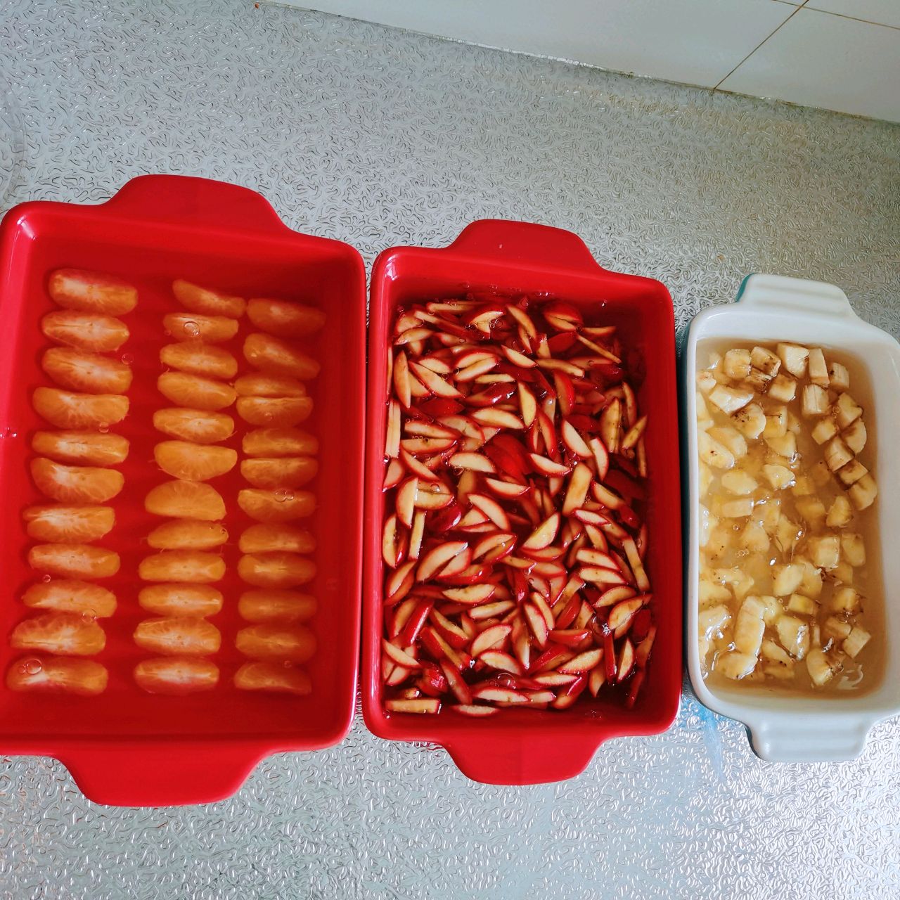 步骤3、桔子,山楂是汁水出锅时切的,到了香蕉的时候有点要凝固了,所以卖相不好。