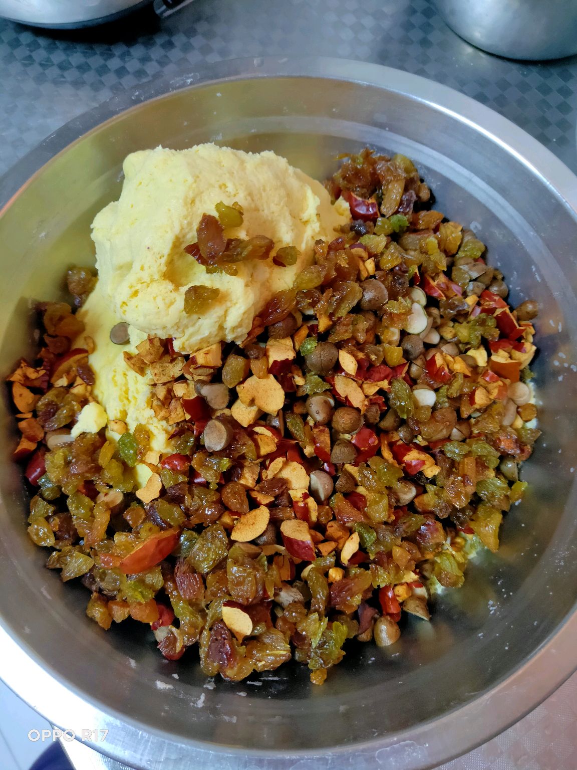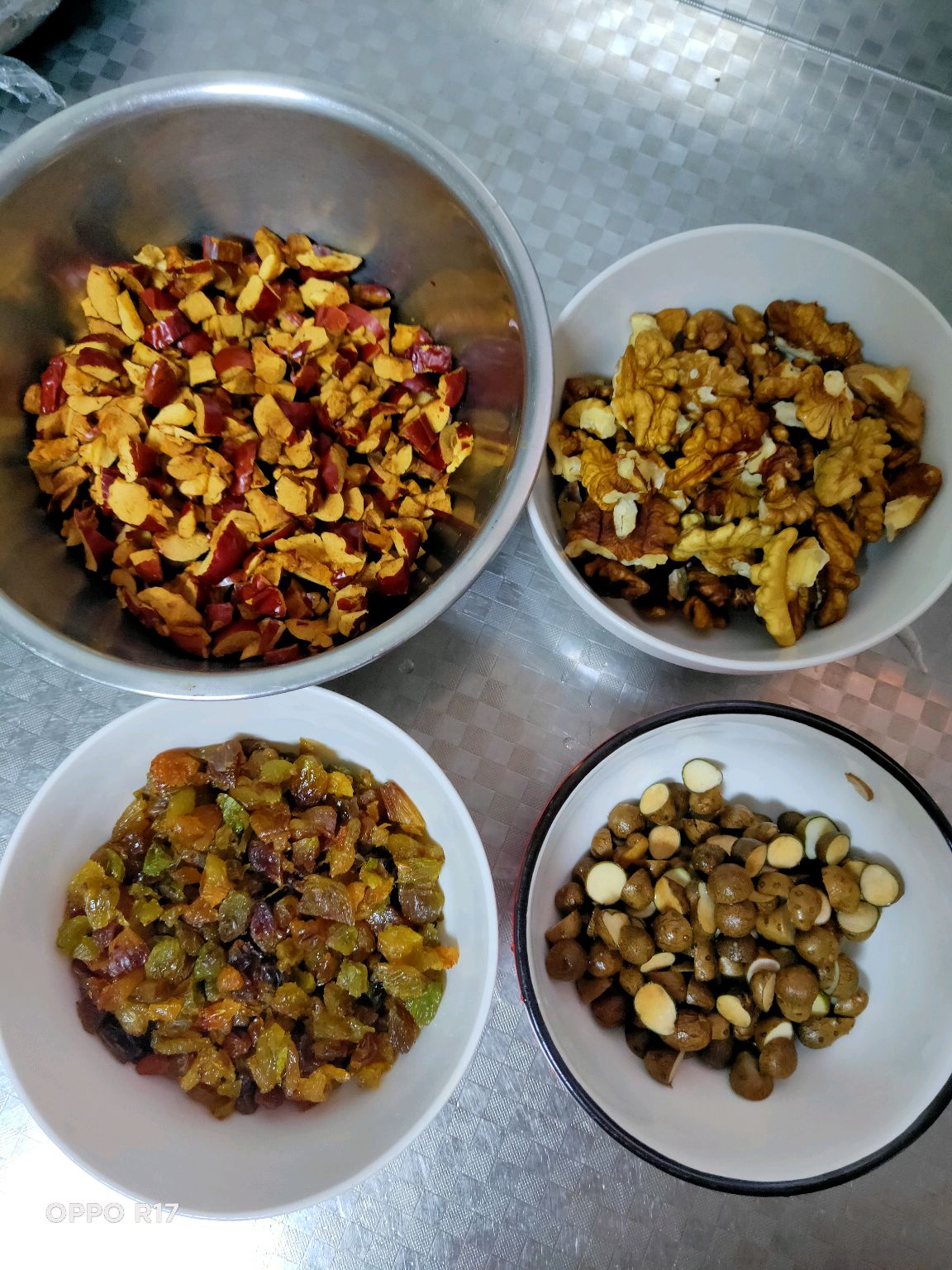辅料:糖适量、酵母4克、温水适量、红枣10颗左右、葡萄干适量、核桃适量、山药豆适量