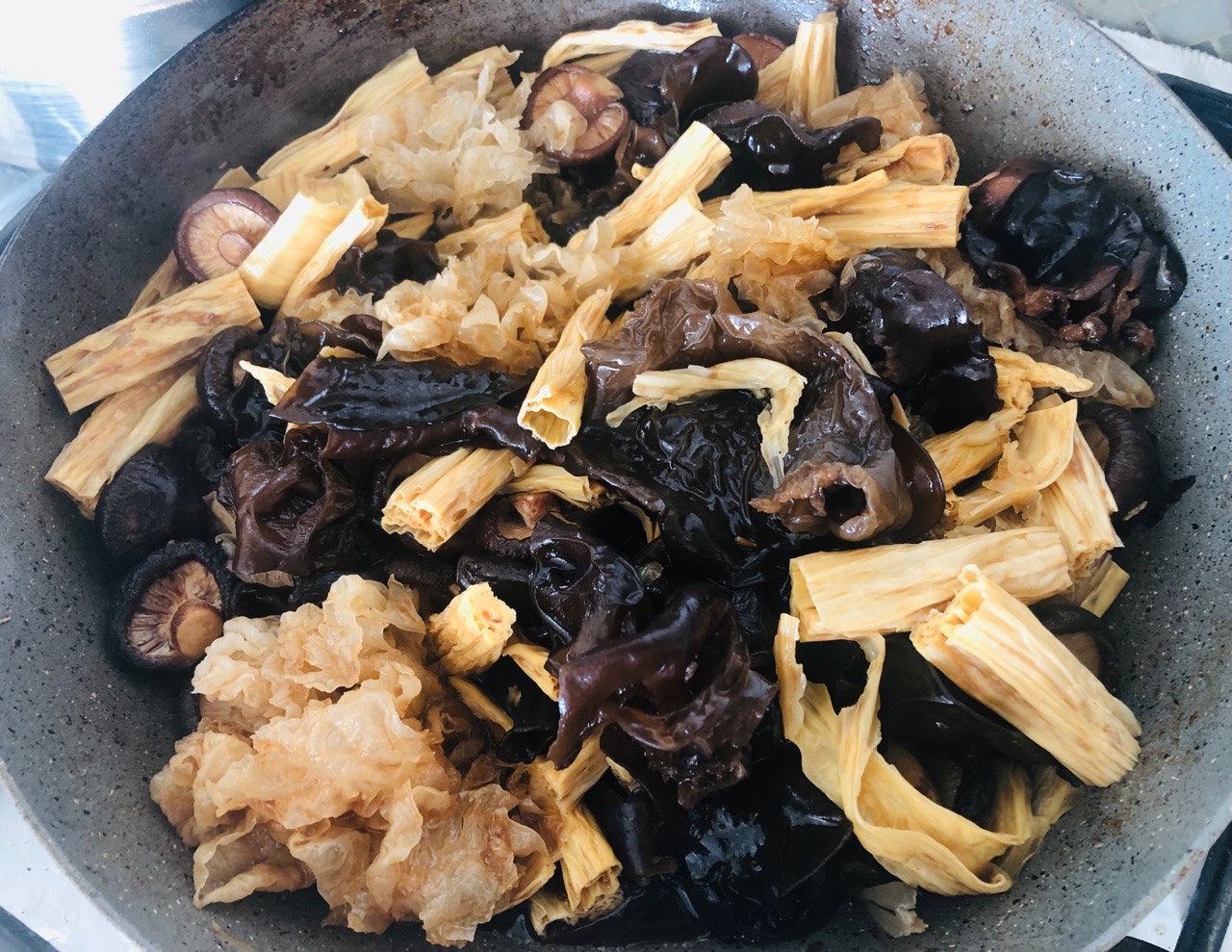 步骤1、前一晚用凉水泡发,冬菇另外泡,泡冬菇的水备用。