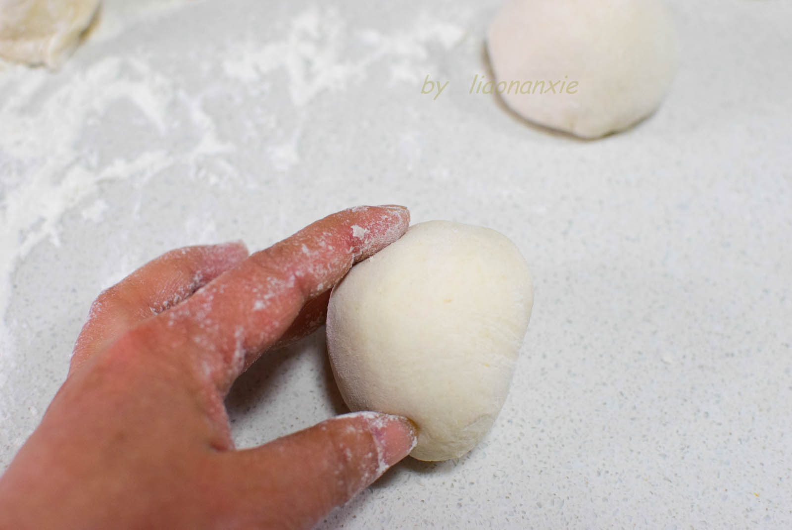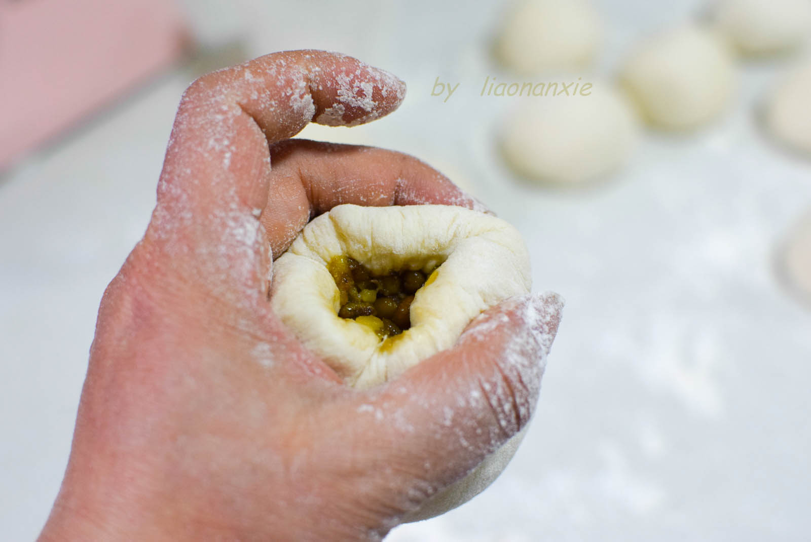 步骤7、然后两手配合,给豆包收口,跟月饼包馅的手法有点像。