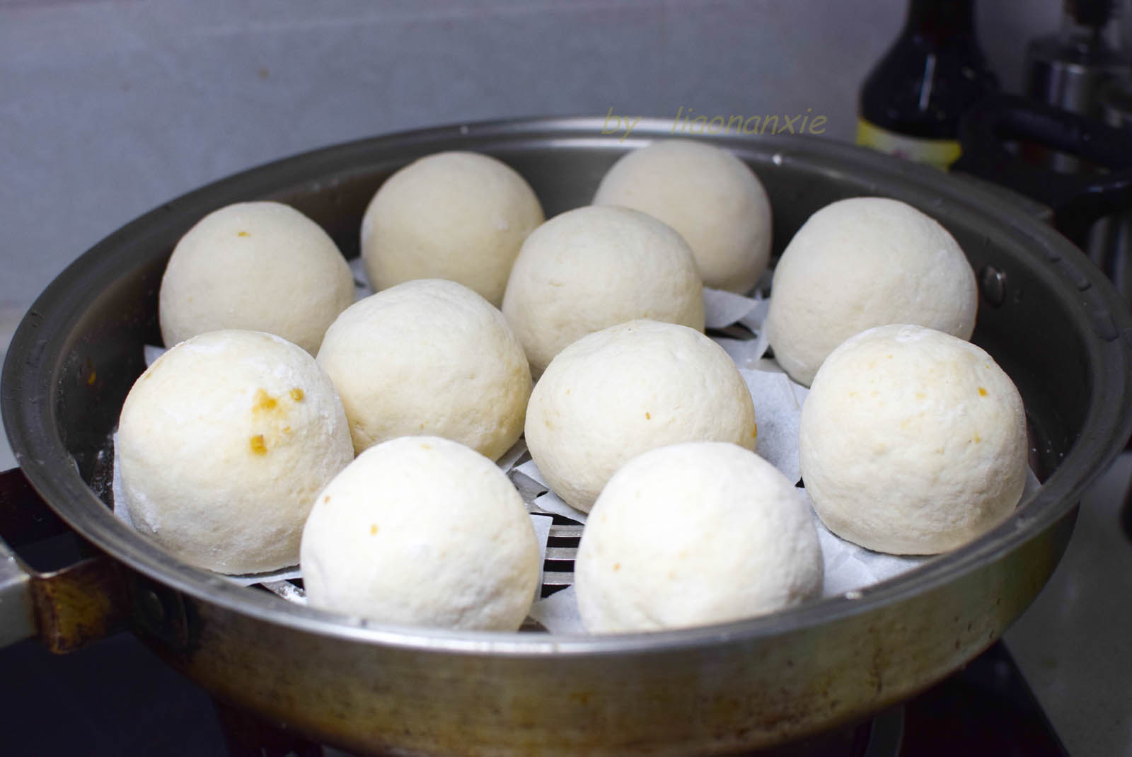 步骤8、包好的豆包放在铺了油纸或者是笼布的蒸笼上醒发,建议用温热的绿豆馅,这样更有助于豆包进行发酵,大约需要半小时,豆包就发好了。