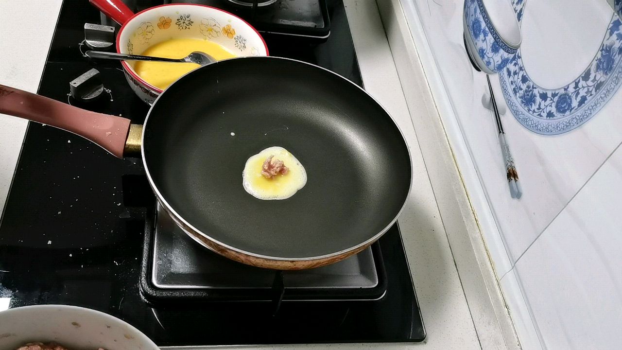 步骤4、蛋饺皮:鸡蛋打散加入适量盐调底味,加入适量水淀粉搅拌均匀,用勺子舀一勺在平底锅铺开放上肉末后对折用筷子边缘压实即可出锅下一个。