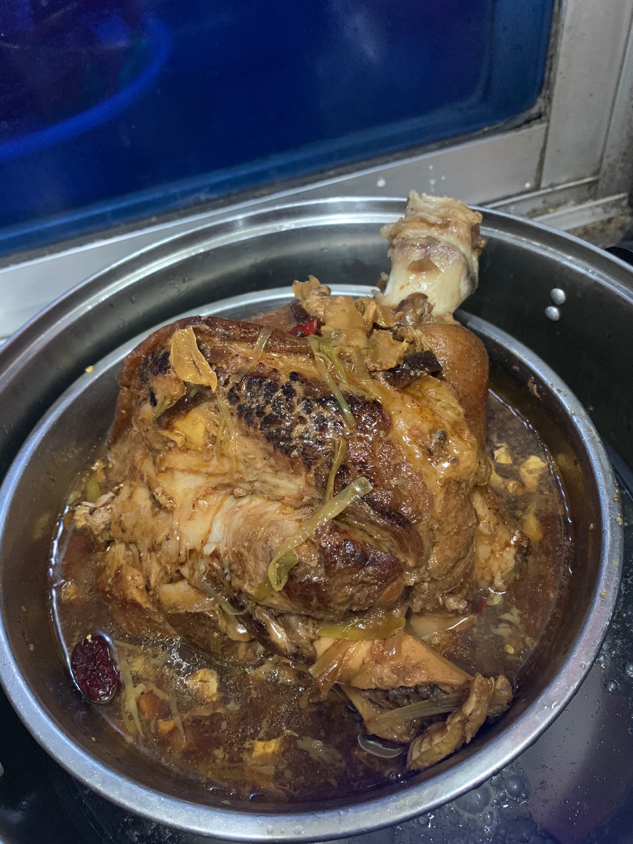 步骤6、隔水炖6小时,每两个小时反一次面并且把蒸出的油脂舀出来,及时给蒸锅里加水。第四个小时用筷子扎洞,保证里面的肉入味。