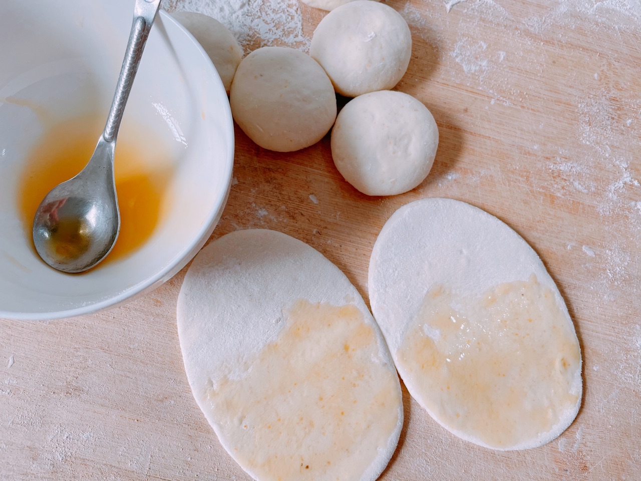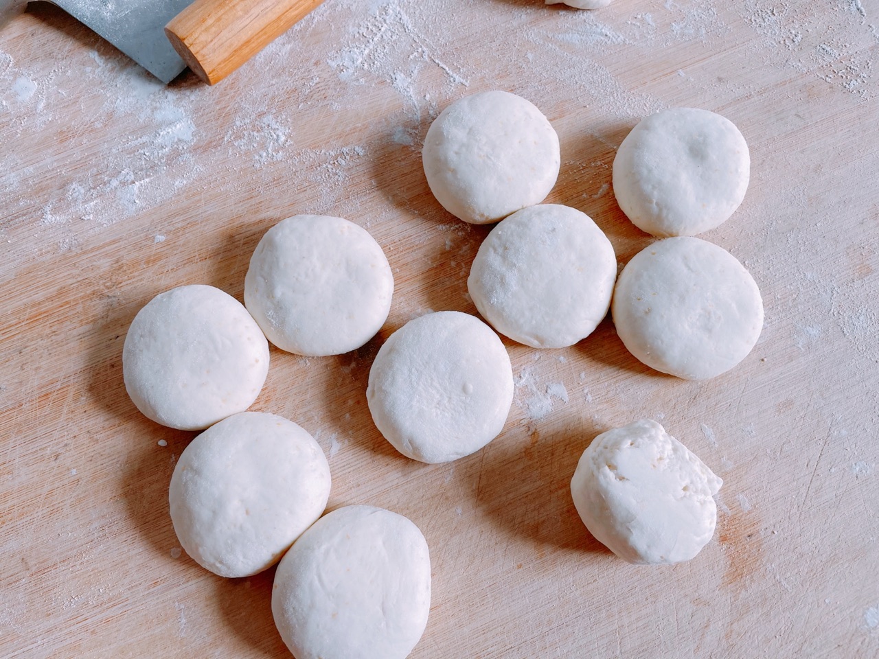 步骤1、把原材料和成面团,放在温暖得地方发酵。发酵好后等分成均匀得面团。揉搓光滑按扁。