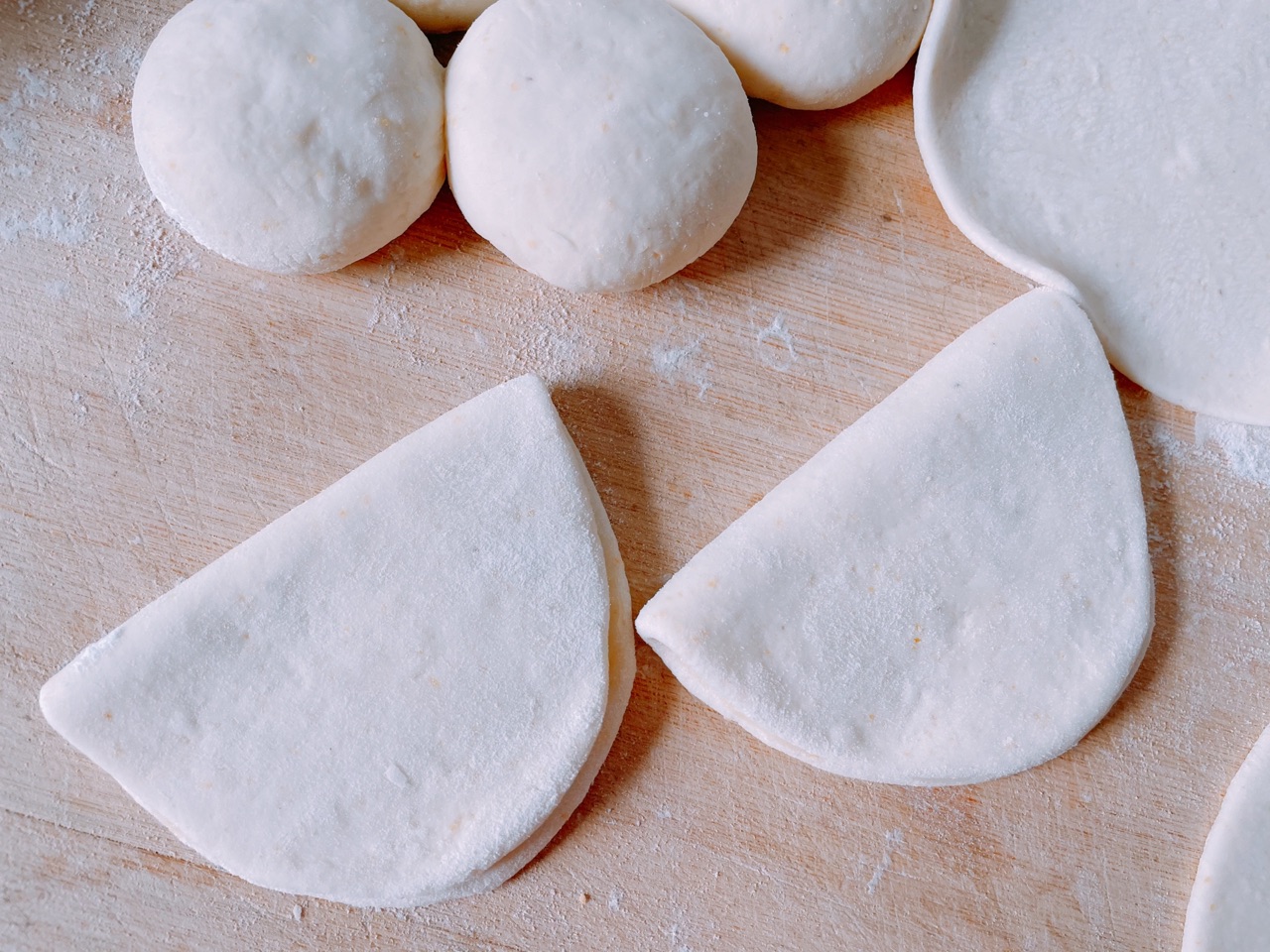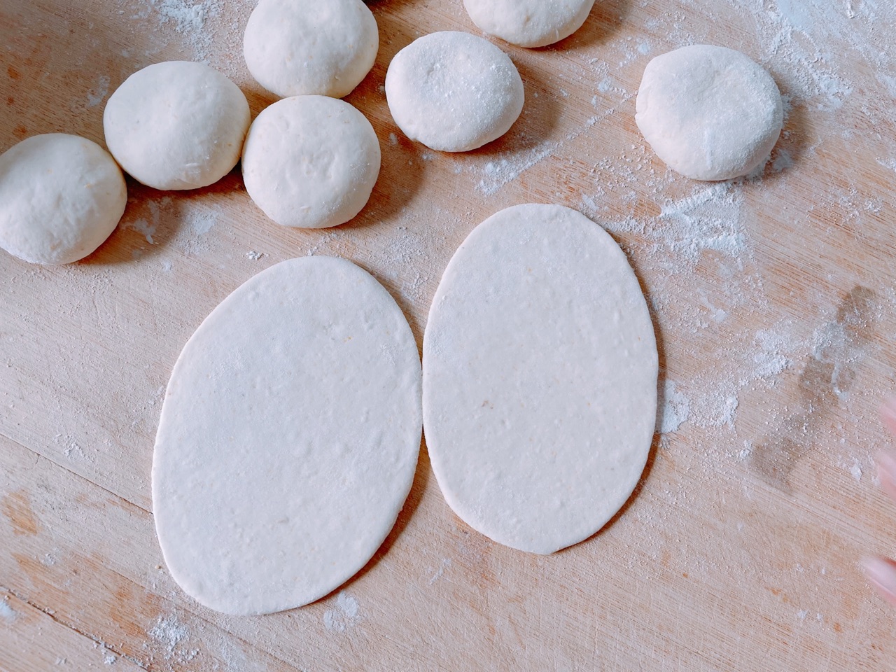 步骤2、擀开成牛舌状,厚度是饺子皮的3倍左右。