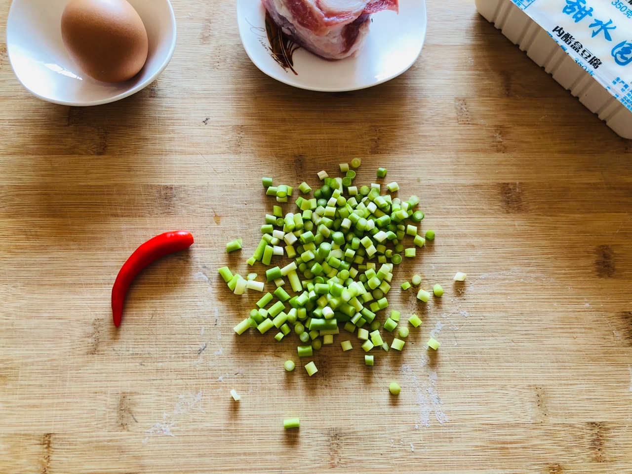 步骤9、倒入切好的蒜苔翻炒均匀后放一边备用。