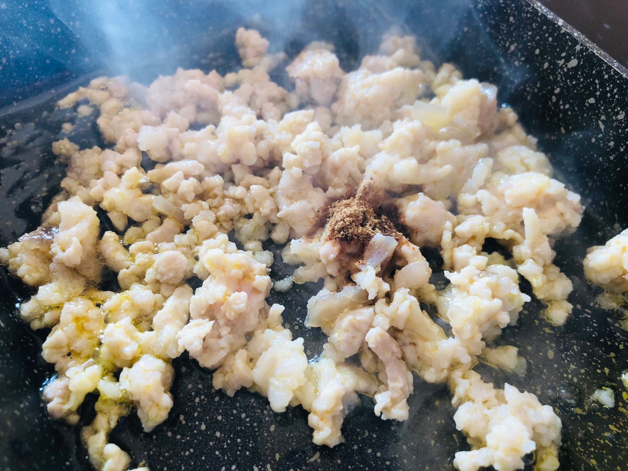 步骤6、锅中倒入少许食用油,放入肉末翻炒均匀。