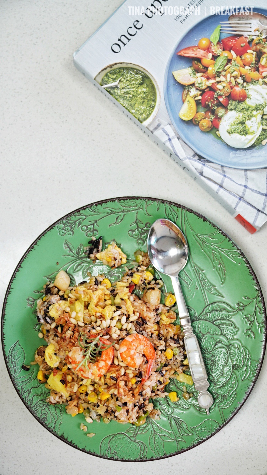 辅料:虾仁8只、玉米粒60克、青豆粒40克、瑶柱20粒、鸡蛋3个、洋葱1/2个、青椒1个、鱼露1汤匙、生抽2汤匙、咖喱粉1汤匙、蚝油1汤匙、盐少许、松仁15克、迷迭香1小支、洋葱酥适量