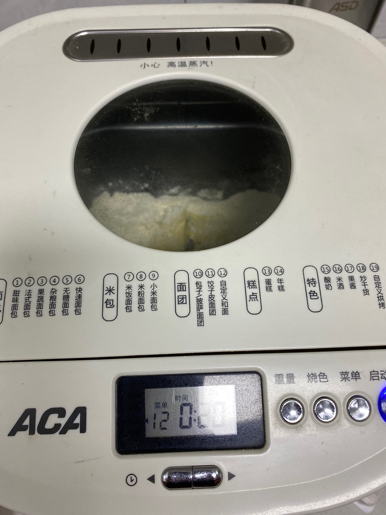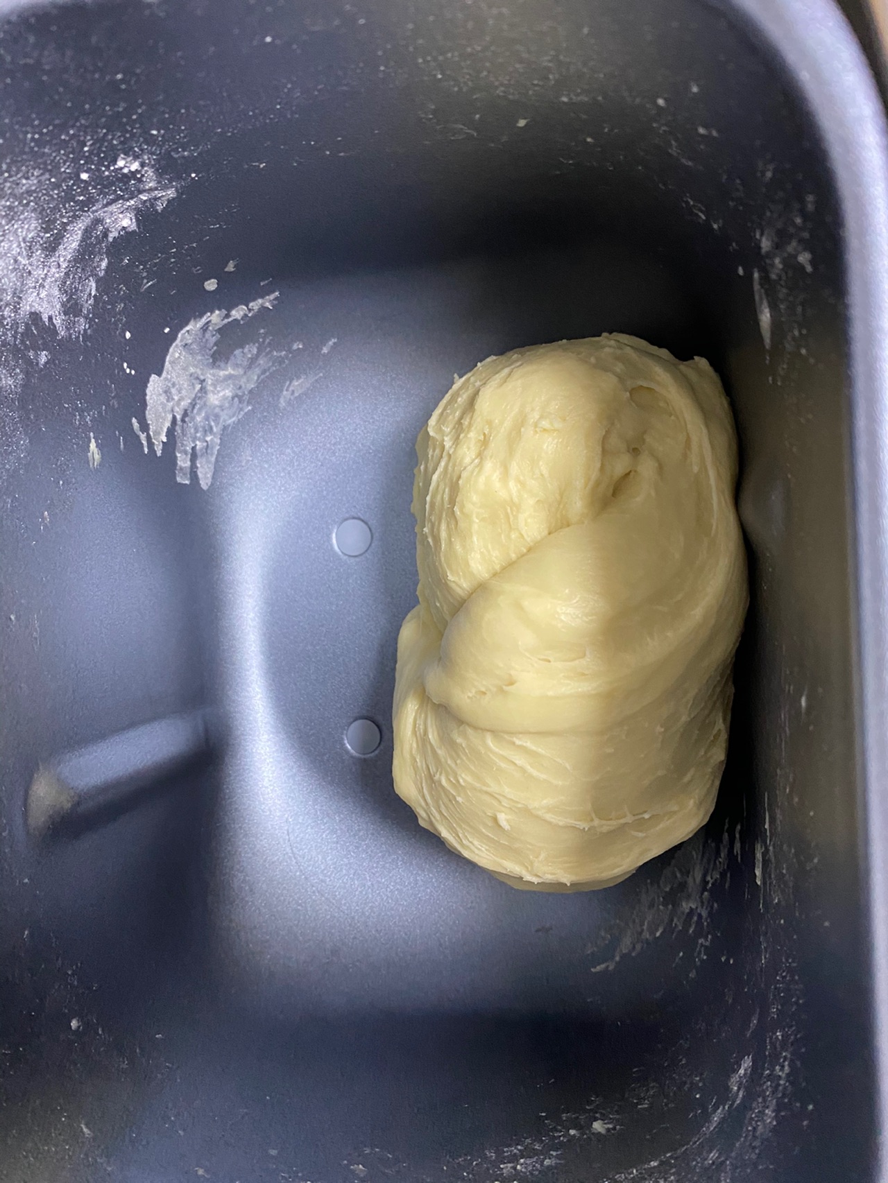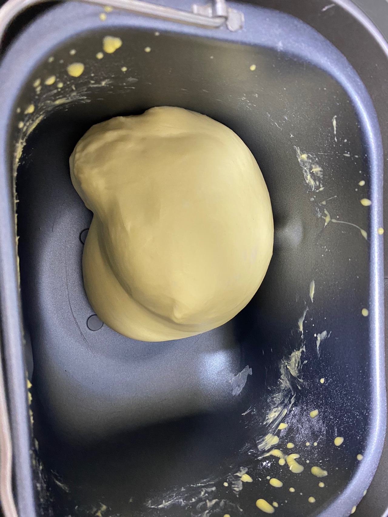 步骤1、将牛奶、糖、炼乳、鸡蛋、面粉、盐、酵母放入面包机中
