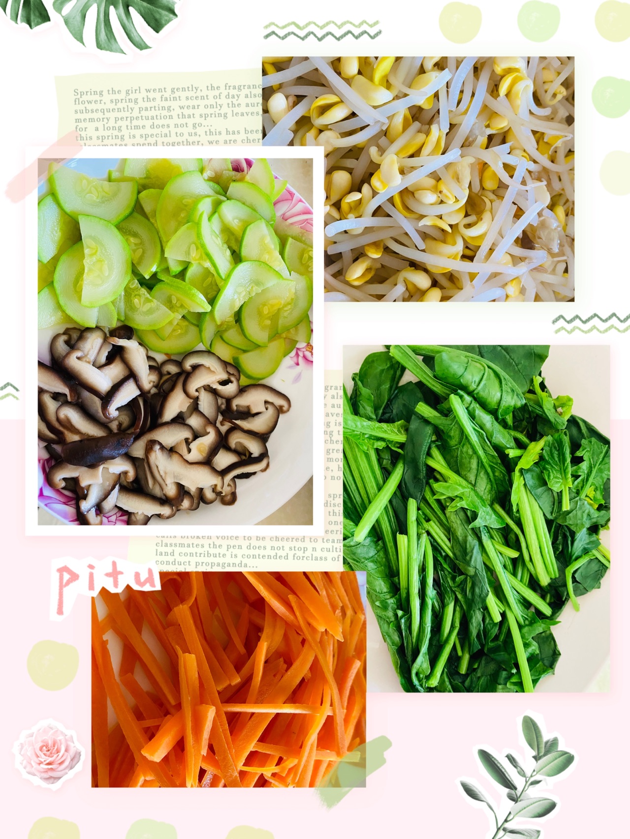 步骤1、香菇、西葫切片,菠菜中间切一刀,胡萝卜切丝,全部焯水捞出备用