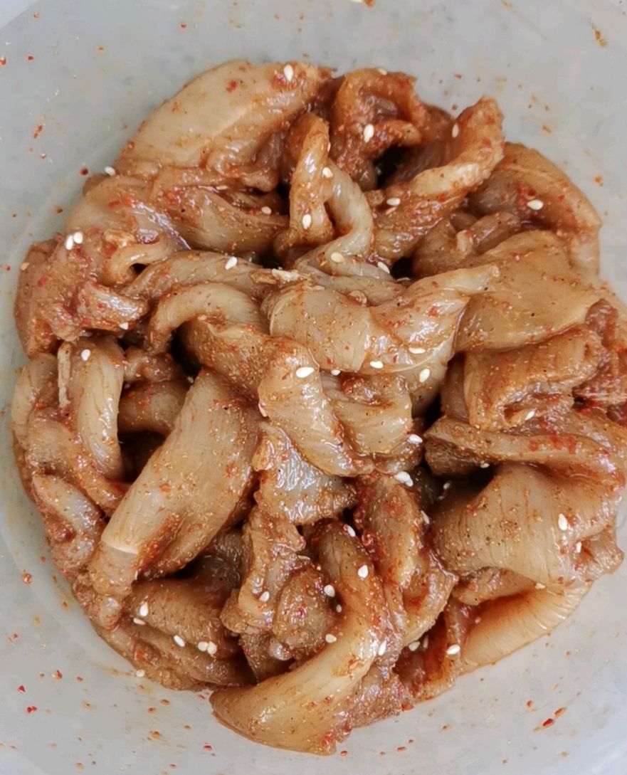 步骤1、鸡脯肉切片(本该用五花肉的,我家娃儿更喜欢鸡脯肉,喜欢五花肉的可用五花肉),加入孜然粉1勺,花椒粉1勺、辣椒粉2勺、十三香1勺、料酒、白酒、生抽、白芝麻适量,盐少许,拌匀腌制半小时以上。
