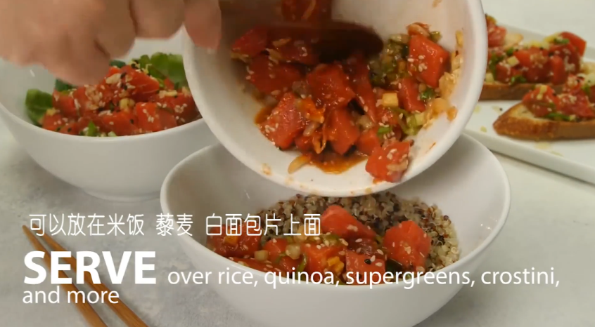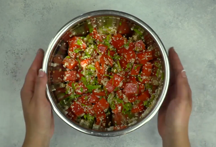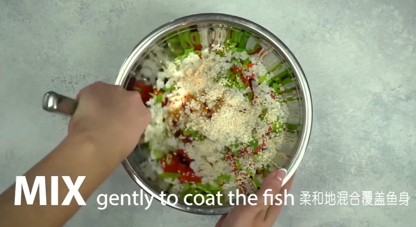 步骤4、将料汁与智利三文鱼块、半碗葱绿末、半碗白洋葱末以及2大勺熟白芝麻粒、3大勺辣椒油搅拌均匀。切记要温柔地搅拌,以免碰碎柔嫩的三文鱼肉。