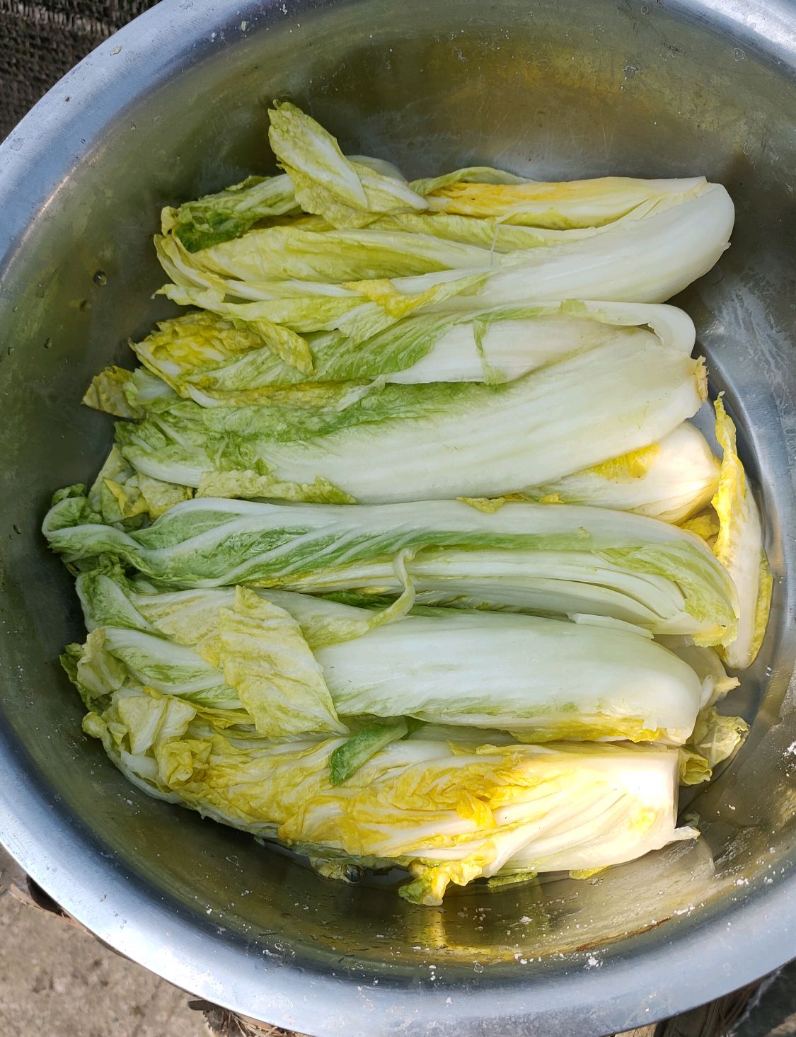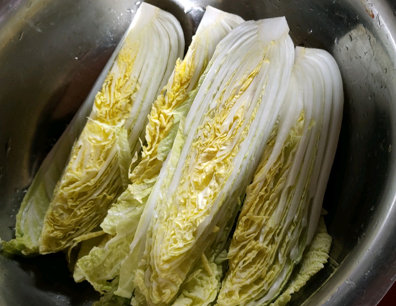 步骤1、两颗白菜取掉最外面两片叶子,然后对剥成4瓣。