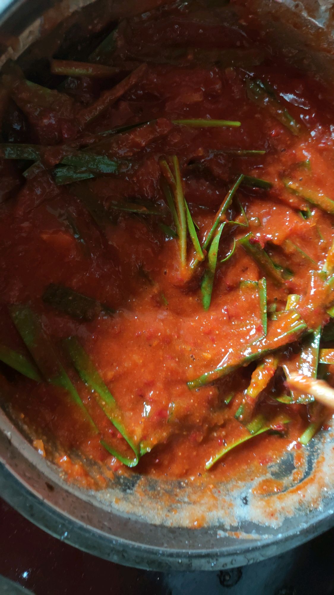 步骤5、打开辣白菜酱,将洗干净的韭菜,切长段放入料中。