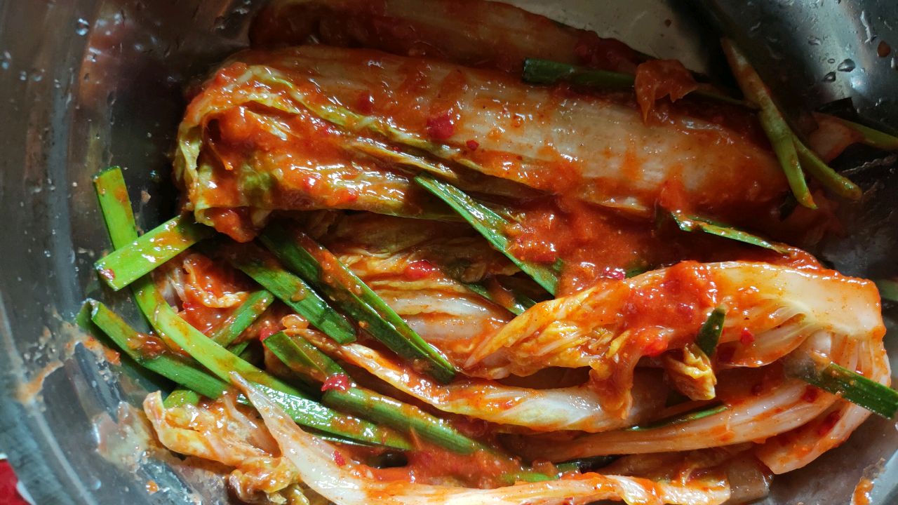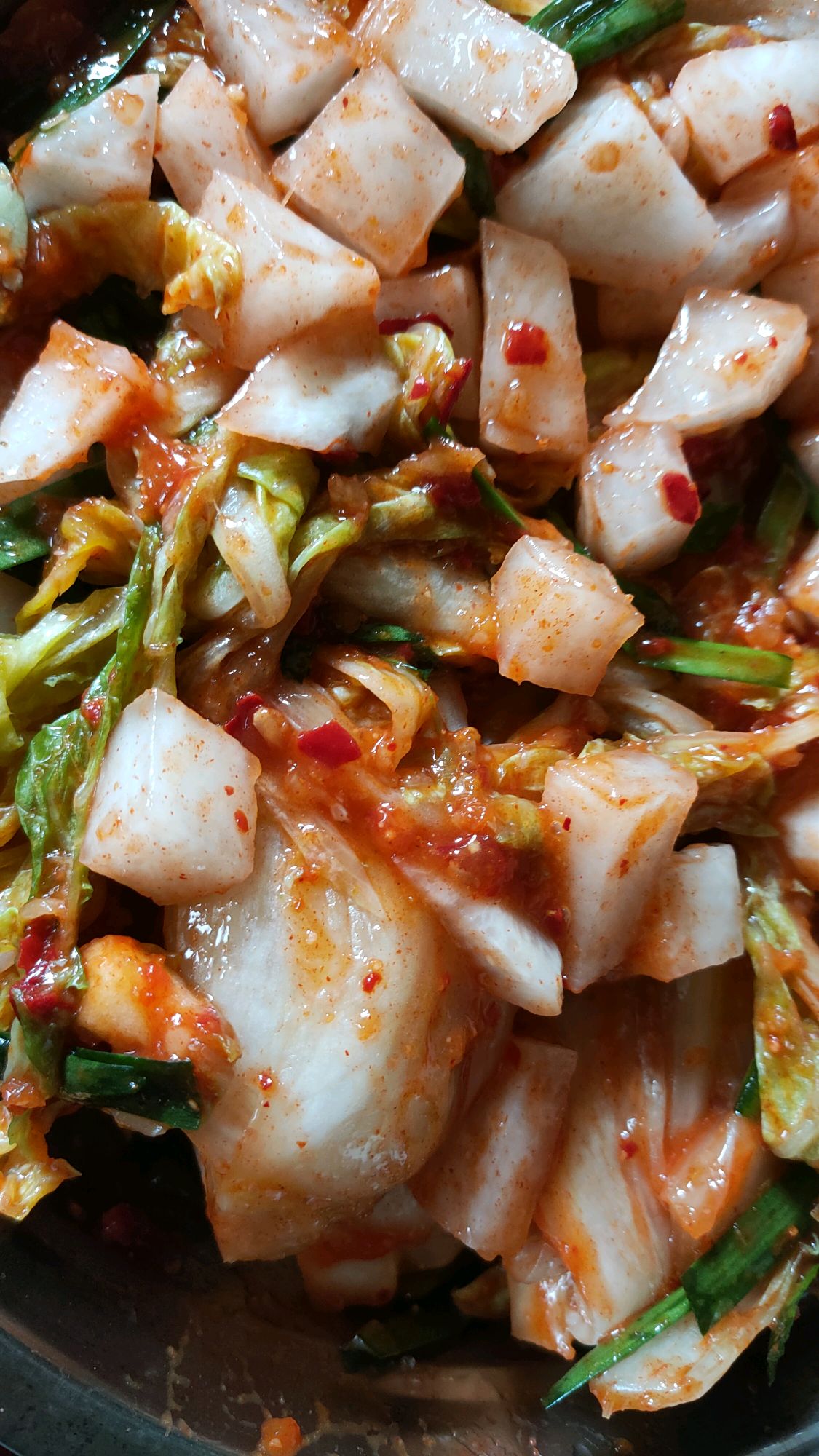 步骤6、将调好的韩式辣酱,与前面抹盐的方法,一片一片,一层层的抹上辣酱,(可加大白萝卜,可在给白菜抹盐腌制时一起腌制,也可以不腌制。萝卜切小块)。抹好后盖上保鲜膜,放进冰箱冷藏一至两天。