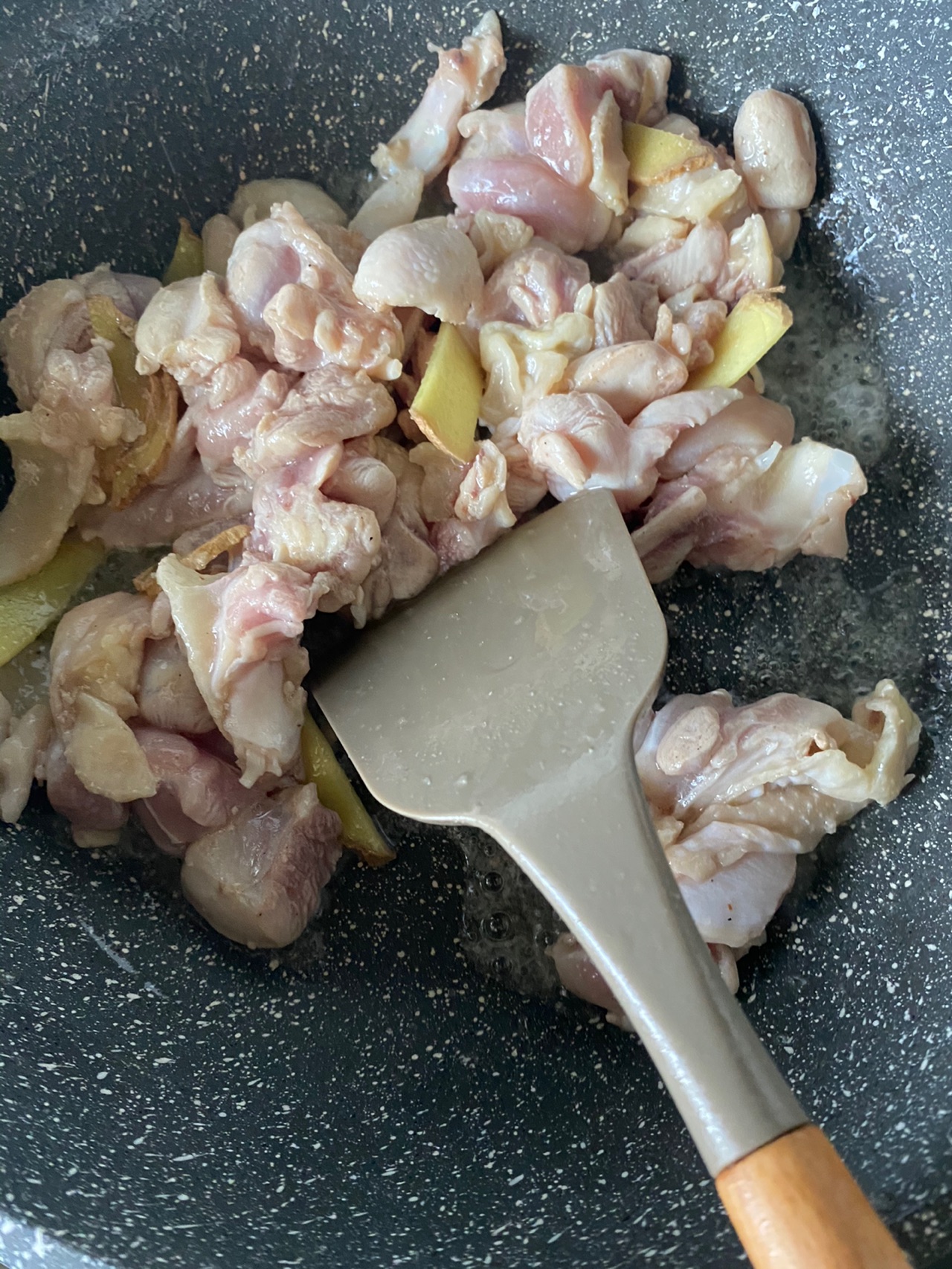 步骤1、鸡腿去骨后切块备用;油热后放入姜片、五香粉炒香;放入鸡腿肉翻炒呀翻炒,炒出水份;