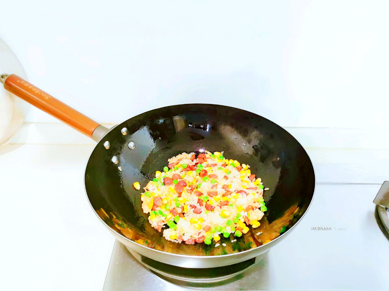 步骤11、锅里放少许油,倒入腊肠炒至晶莹。