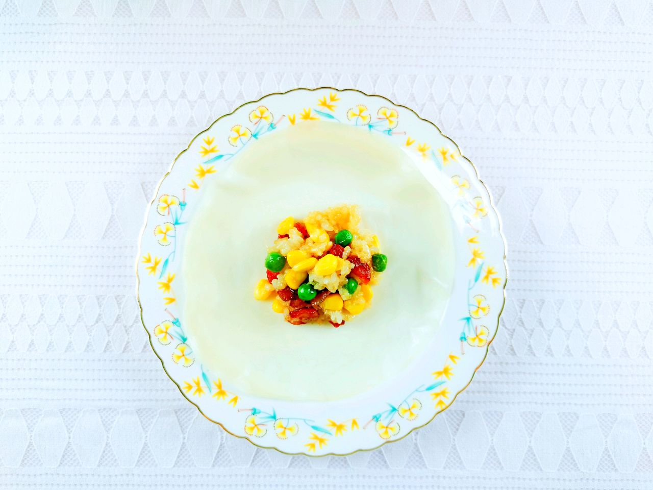步骤8、水开后倒入青豆和玉米粒焯熟。