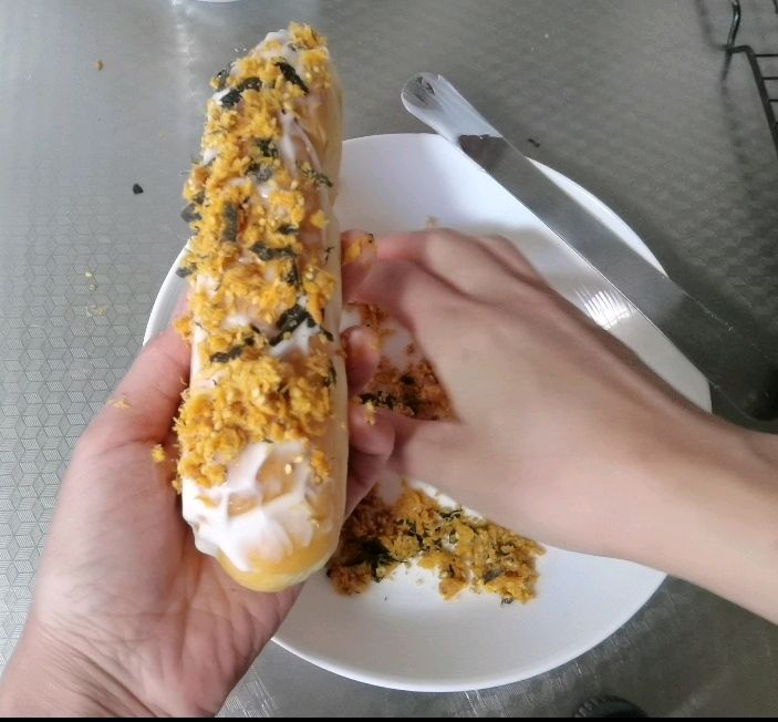辅料:新鲜酵母9克、奶粉10克、蛋液25克、盐3克、牛奶100克、水50克、黄油30克、海苔肉松碎(装饰用)适量、沙拉酱(装饰用)少许