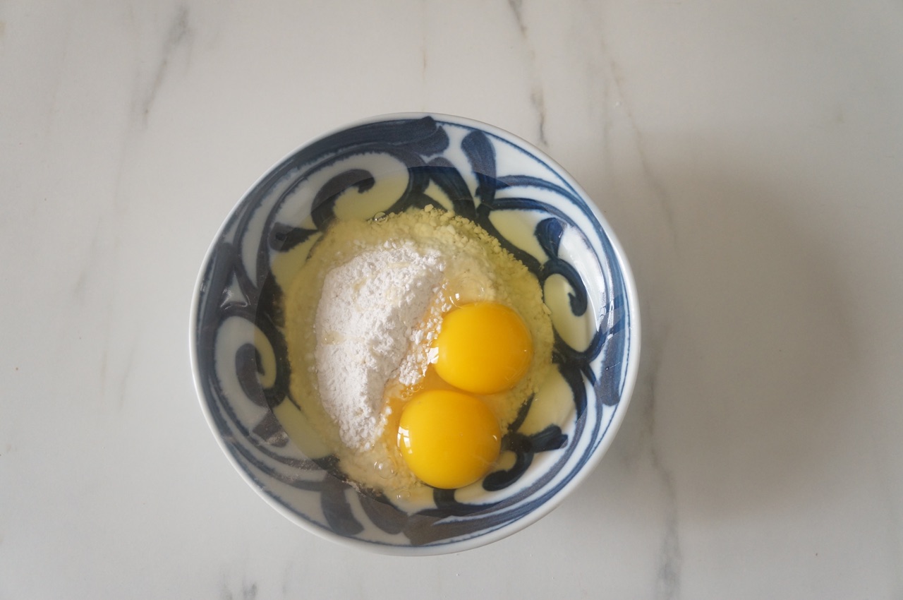 步骤4、红薯淀粉加鸡蛋搅拌均匀,静置15分钟,我用的有颗粒的红薯粉,刚开始搅拌有疙瘩没关系,静置一会就好了