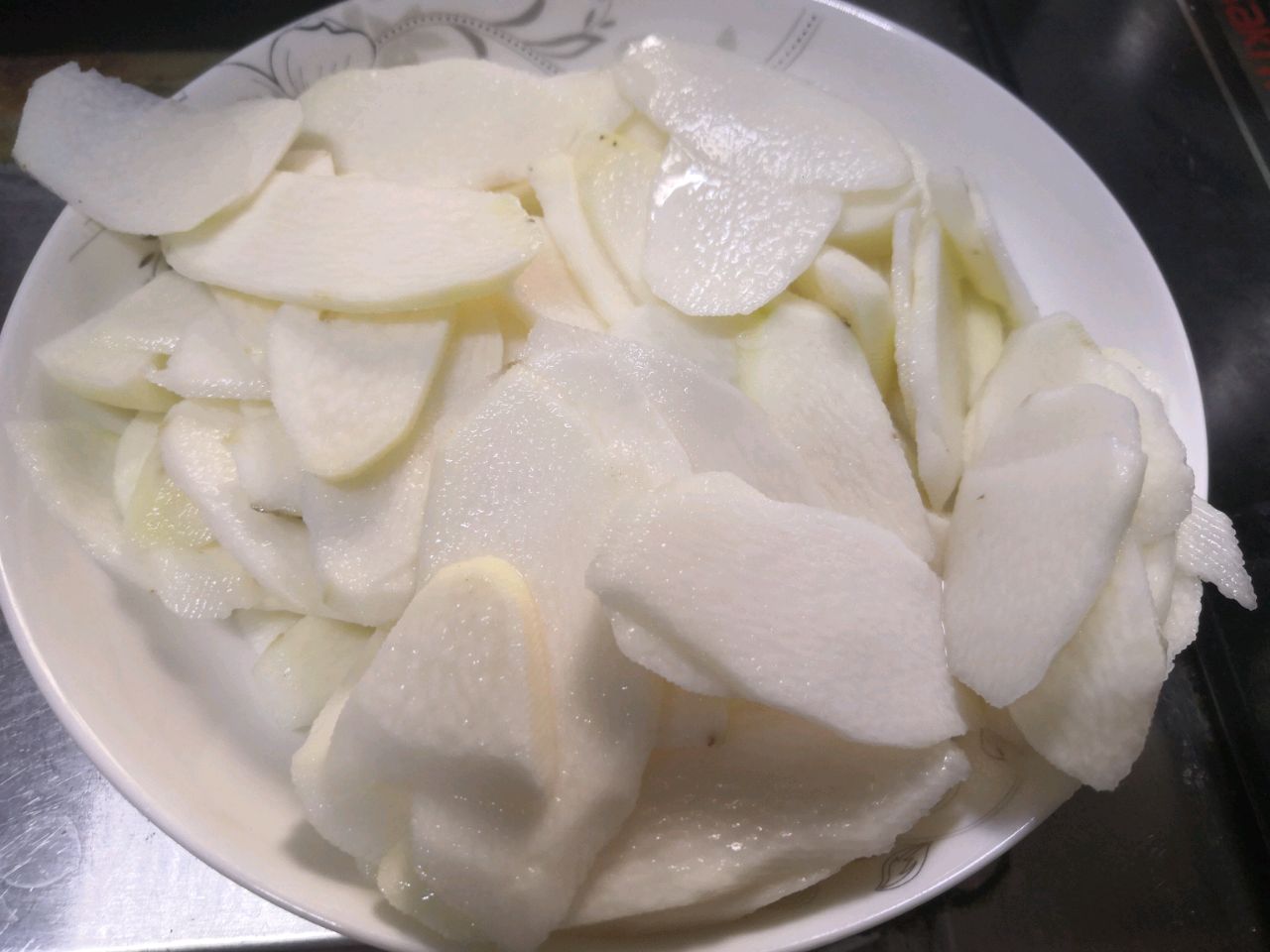 步骤2、山药斜切成片,泡在水里,这样不容易氧化发黑。