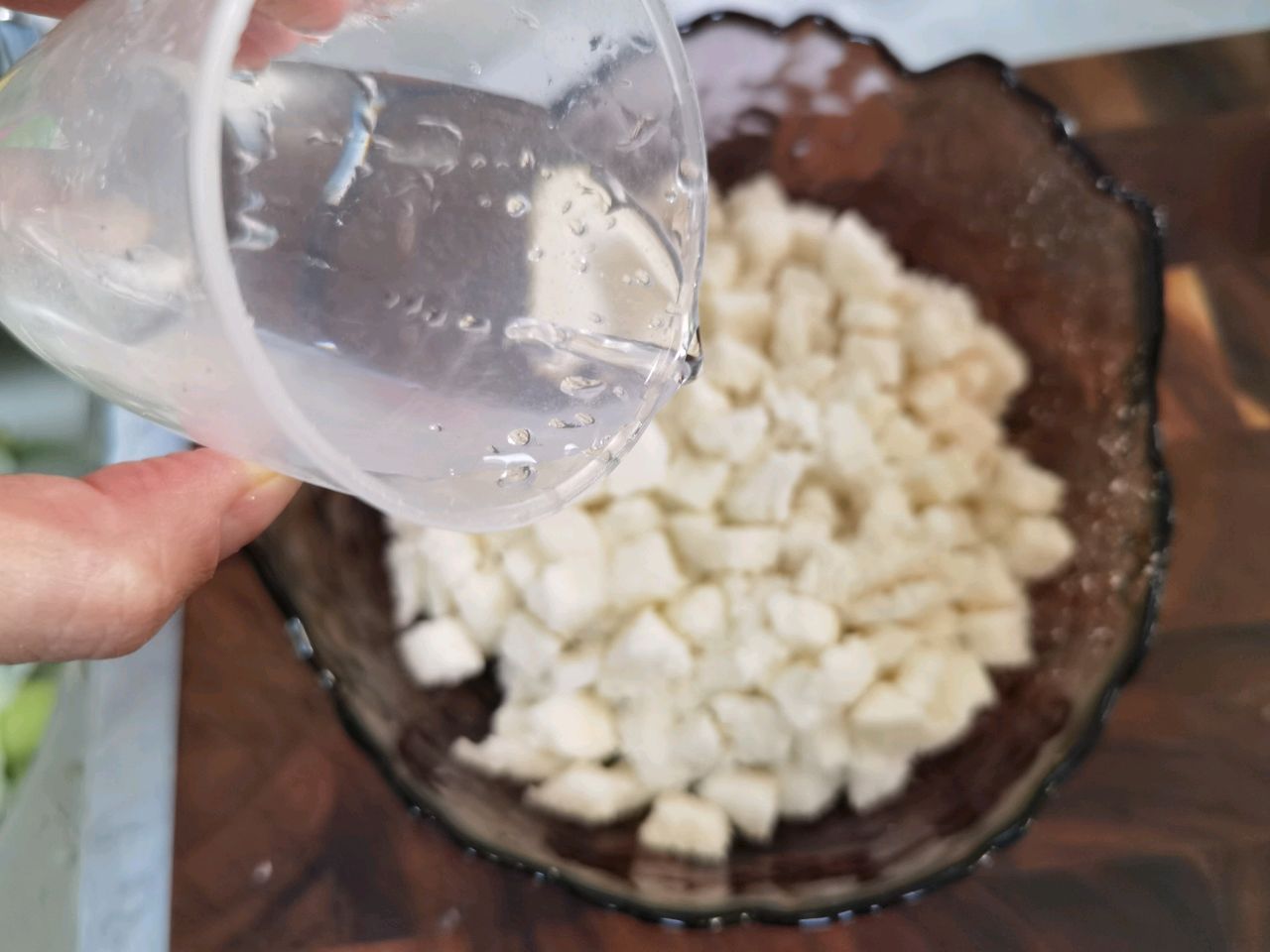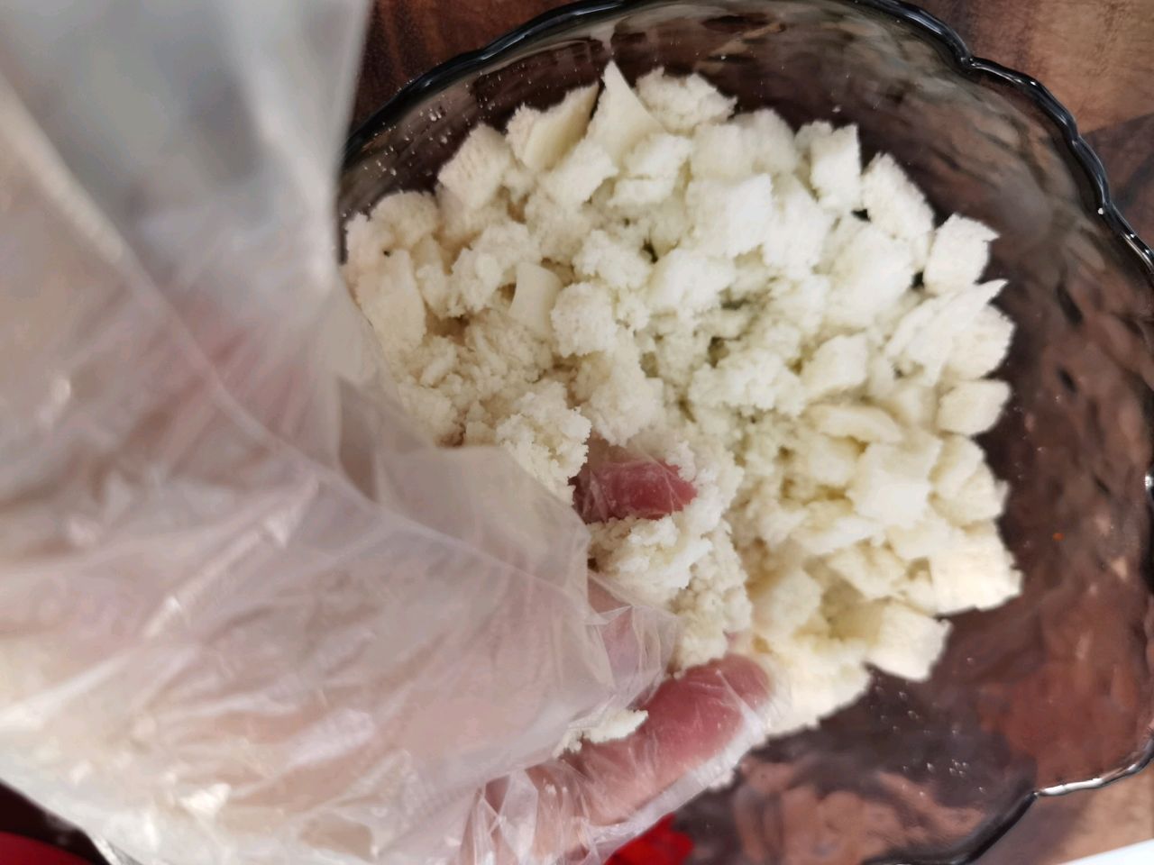 步骤3、馒头切丁撒上一点点水,让馒头丁吸收水分变软待用