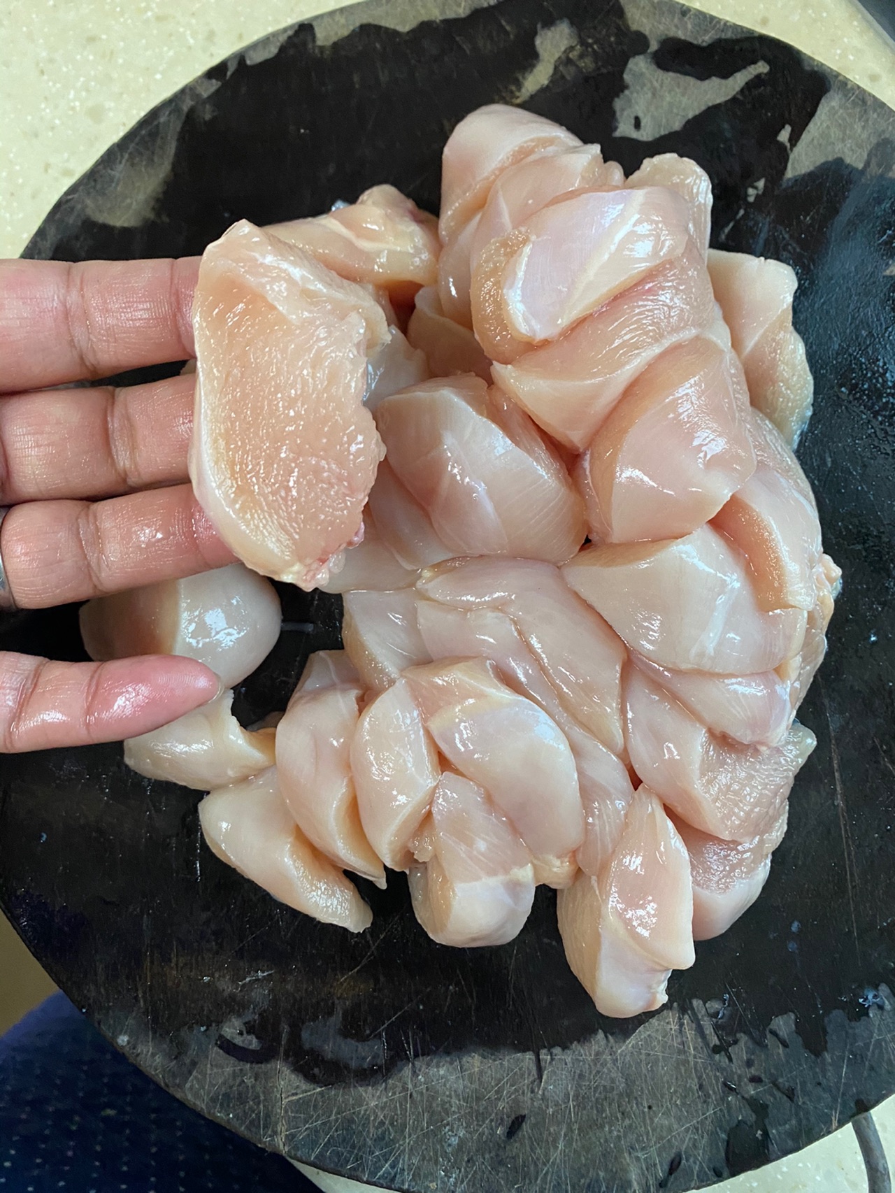 步骤1、鸡胸肉切大块,或者其他鸡肉都可以切块做