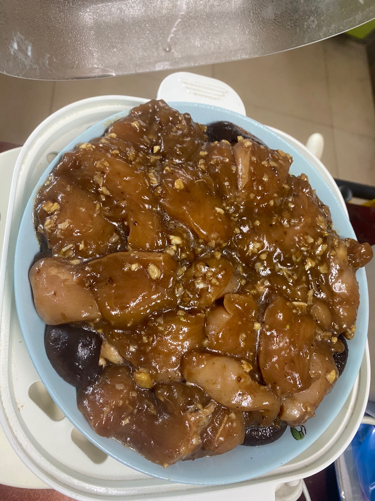辅料:香菇几朵、蒸鱼豉油2勺、耗油1勺、料酒2勺、黄豆酱2勺、黑胡椒酱或粉1勺、面1勺、小苏打少许、蒜半头、姜3片、盐1勺
