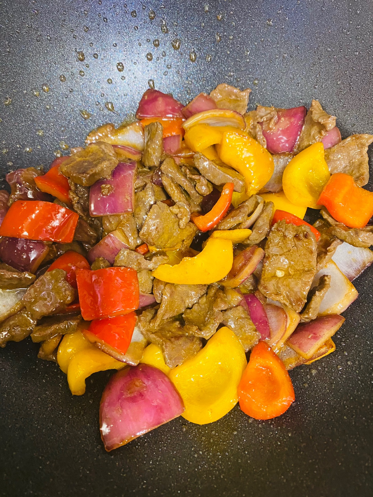 步骤7、下入滑好的牛肉,加入料酒2勺,蚝油2勺,翻炒均匀上色