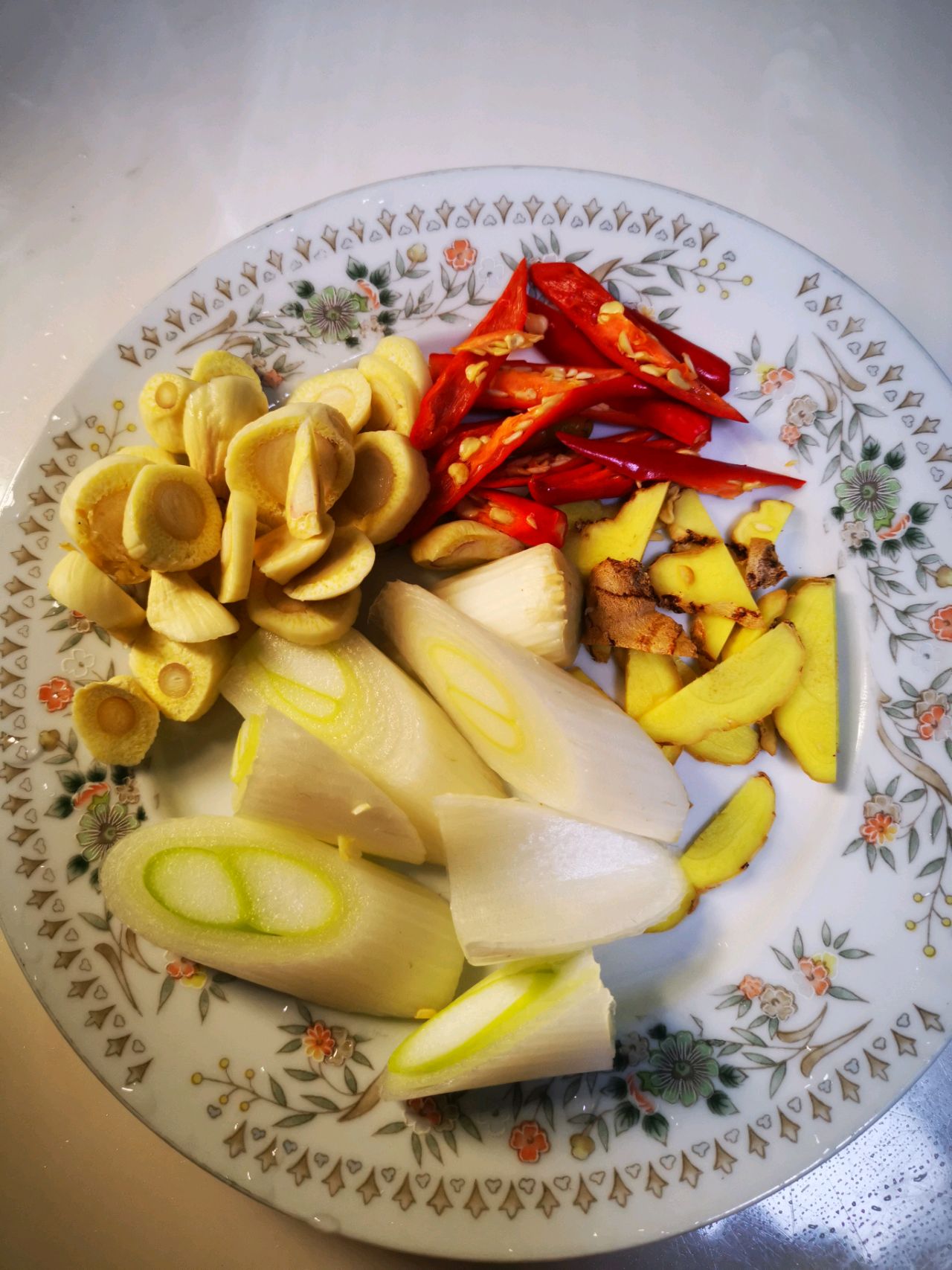 步骤1、姜、葱、蒜、小米辣切成上图样子