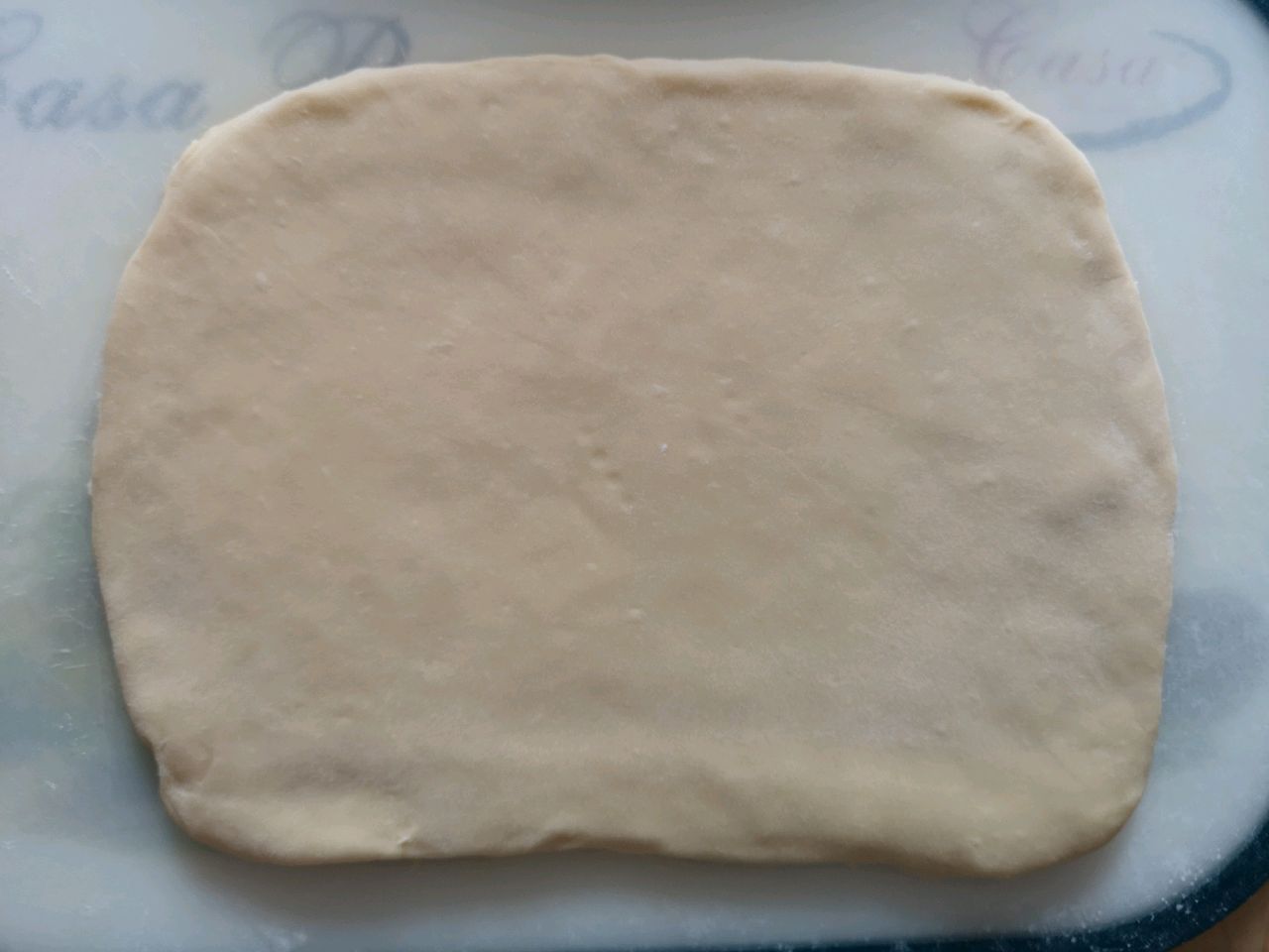 步骤2、水面分两块,把两块水面和一块油面分别擀成一样大小,水面饼+油面饼+水面饼,按照这个顺序放好。