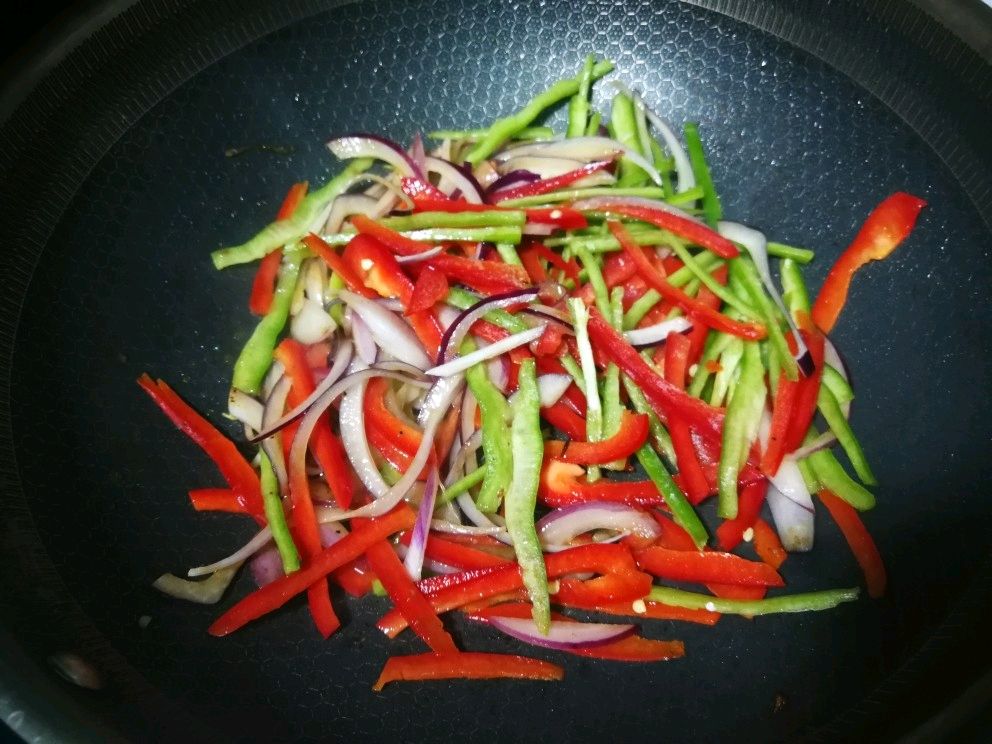 步骤6、倒入洋葱和青红椒,炒至八成熟。