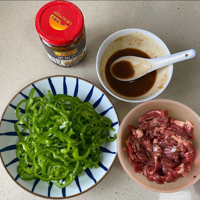 步骤1、青椒切丝洗净控干水份备用;酱汁:黑胡椒酱1勺、蚝油1勺、生抽1勺、淀粉半勺、油1勺、糖一小撮(能提鲜按每家口味可以不放)、盐一小撮(这个酱汁味道基本差不多了我没放盐如果觉得淡了出锅前稍微放点);取一半酱汁放入牛肉抓匀(酱15分钟左右);