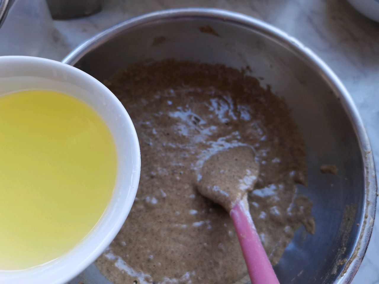 步骤9、分次加入面糊中,翻拌均匀。