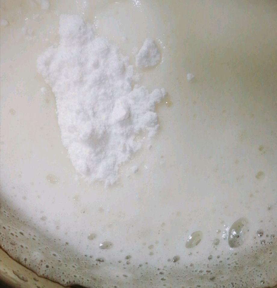 步骤8、最后一次稍微有纹路的时候加入最后三分之一的糖粉,再加入5克玉米淀粉