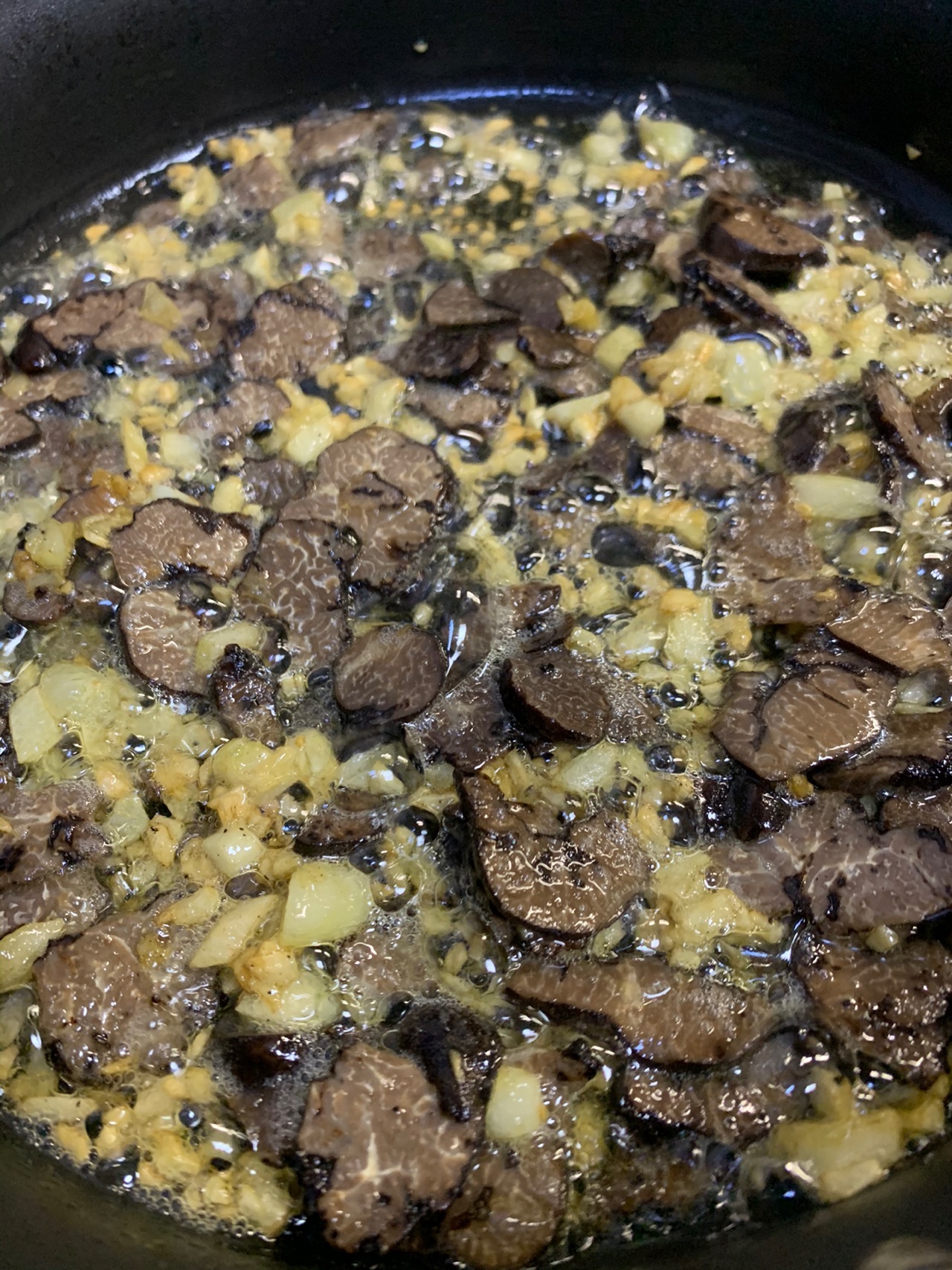 步骤9、看着蒜末炒的差不多了,把黑松露放进来